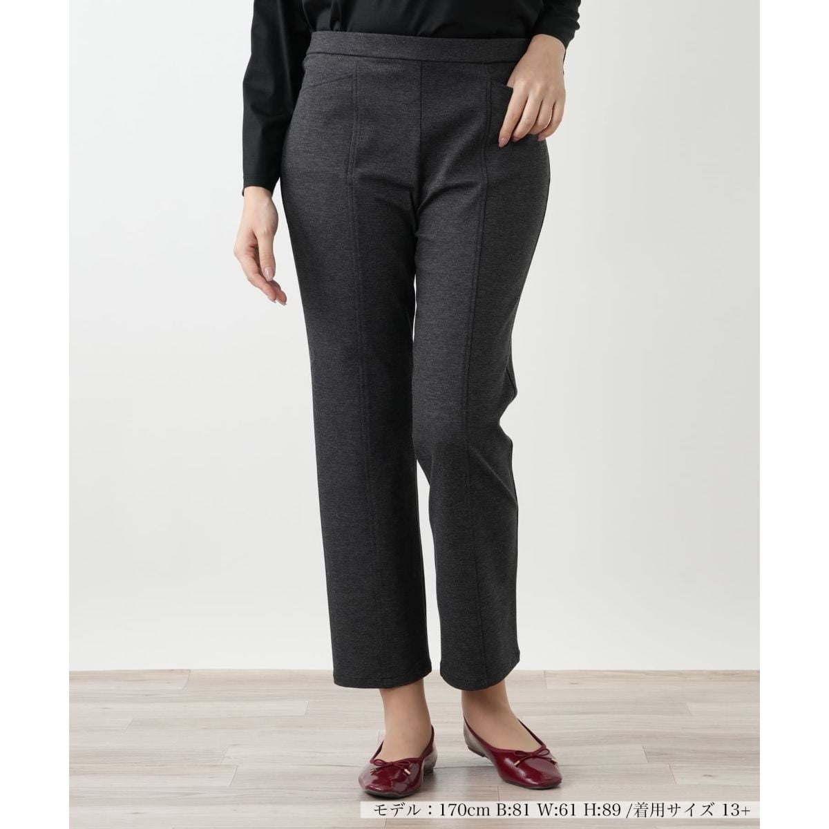 フロントの切り替えが、足長効果をもたらすスリムパンツです。伸縮性のあるジャージー素材とウエストゴム仕様で、快適な履き心地を実現。きれいなシルエットが、上品な印象を与えます。秋のコーディネートに活躍する一本です。