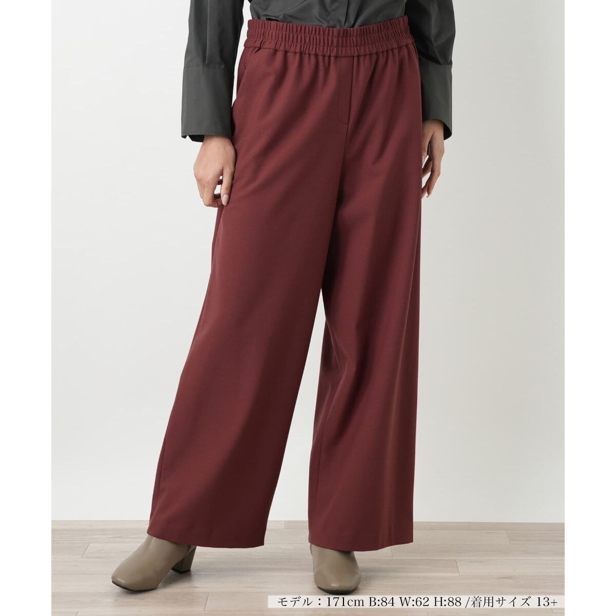 伸縮性のある素材で仕立てた、快適な履き心地のワイドパンツです。ウエストゴム仕様でリラックス感がありながらも、きれいなシルエットが上品な印象。秋のコーディネートに活躍する一枚です。