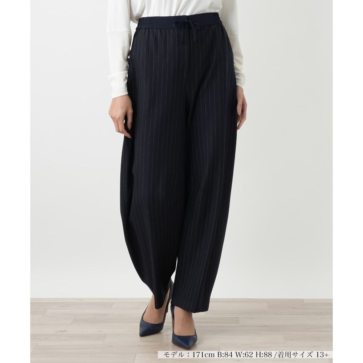 快適な穿き心地と美しいシルエットを両立する、ストライプ柄パンツ。ポリエステル、レーヨン、アクリルをブレンドした素材に、ポリウレタンを混紡することで、程よいストレッチ性を実現いたしました。ご自宅で手洗いできるウォッシャブル仕様で、日常のお手入れも簡単。ウエストはゴム入りで、窮屈感なく快適にお召しいただけます。フィット感がありながらも、体を締め付けすぎない絶妙なサイズ感で、脚のラインをすっきりと見せてくれます。秋のデイリースタイルから、きれいめなオフィススタイルまで幅広くお楽しみいただける一本です。