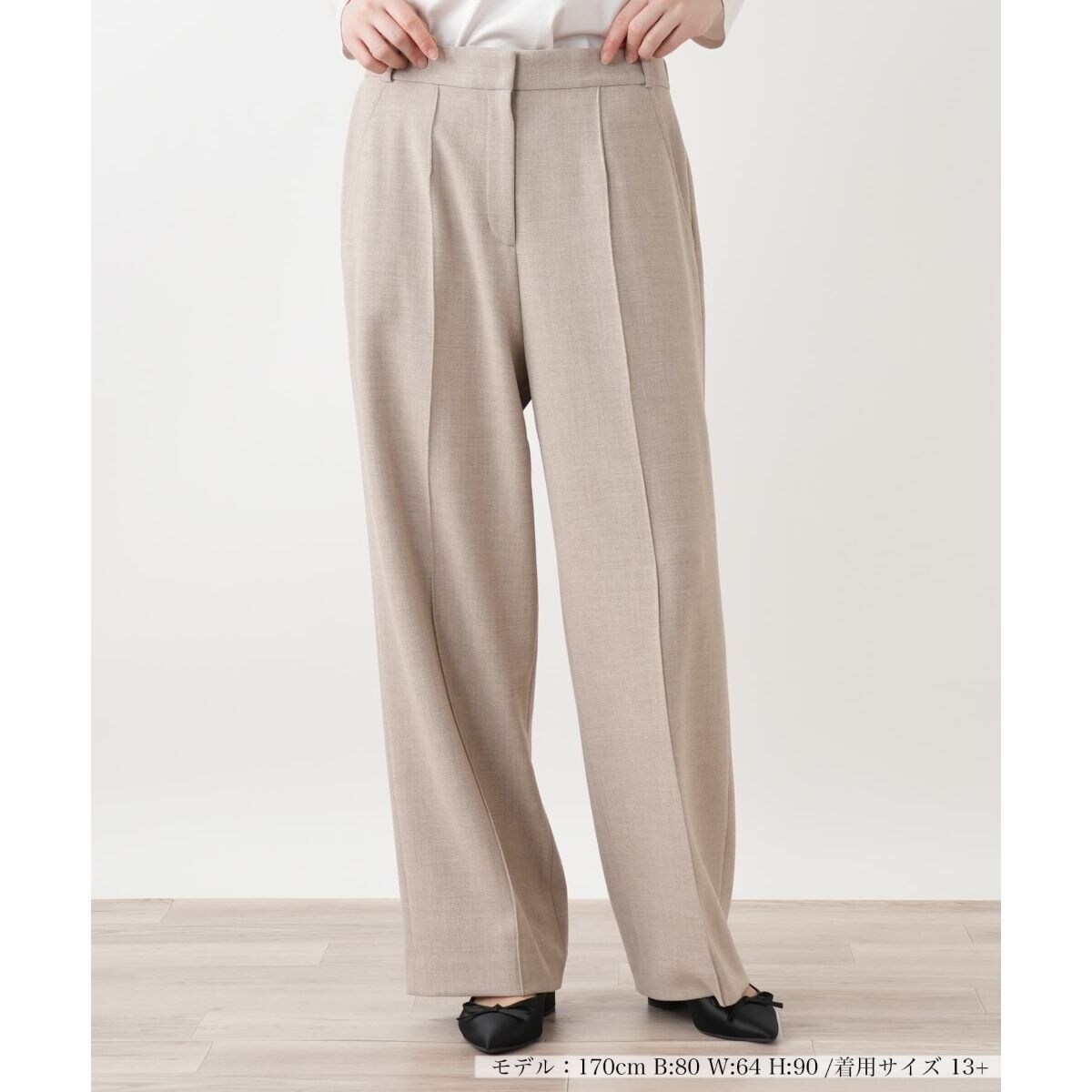 洗練されたシルエットが魅力のワイドパンツです。フロントに入ったタックが、腰回りにゆとりを持たせつつ、すとんと落ちるストレートなラインが脚を長く美しく見せます。上品な光沢感とハリのある生地は、きちんと感を演出し、ビジネスシーンからセレモニーまで幅広い場面で活躍。ウエストはすっきりとしたデザインで、トップスインもしやすく、着こなしの幅が広がります。