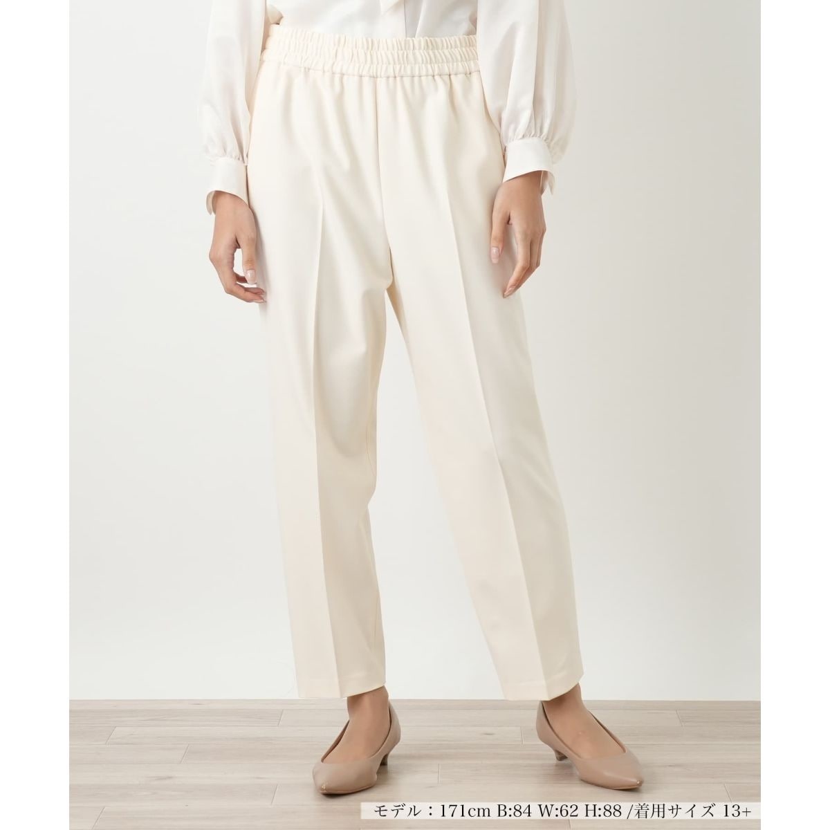 伸縮性のある素材で仕立てた、快適な履き心地のパンツです。ウエストゴム仕様でリラックス感がありながらも、きれいなシルエットが上品な印象。秋のコーディネートに活躍する一枚です。
