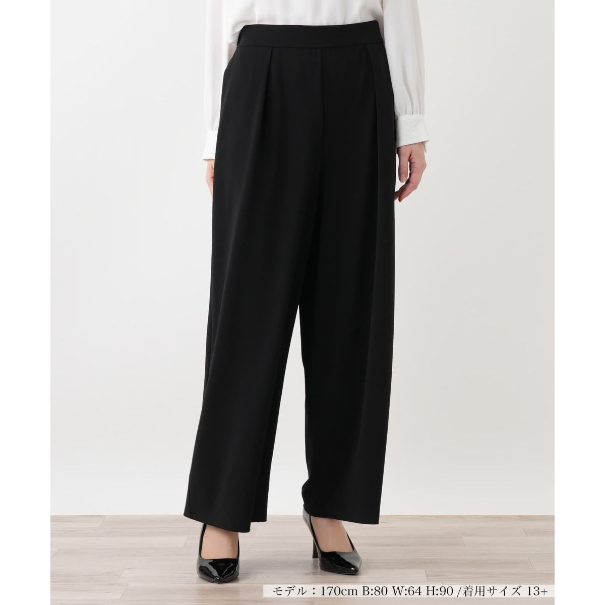 ポリエステルとポリウレタンをブレンドした、快適な穿き心地のワイドパンツ。しなやかな肌触りと優れたストレッチ性で、長時間の着用でもストレスフリーです。ご自宅で手洗いできるウォッシャブル仕様で、日常のお手入れも簡単。ウエストはゴム入りで、窮屈感なくフィット。ゆったりとしたワイドシルエットは、脚のラインを拾いすぎず、優雅な動きを演出します。秋のデイリースタイルから、きれいめなオフィススタイルまで幅広くお楽しみいただける一本です。