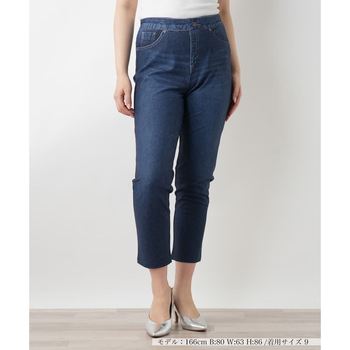 デニムのプリントを施した、軽やかな印象を与えるクロップド丈のスリムパンツ。フロントはフェイクポケット仕様ですっきり見せつつ、ヒップのポケットは実用的に使えるリアルなデザインとなっています。生地にはストレッチ性があり、見た目以上に柔らかく、ストレスフリーなはき心地を実感できます。すっきりとしたシルエットで足元に抜け感を演出し、デイリーカジュアルにもきれいめなフェミニンルックにもフィットするアイテムです。