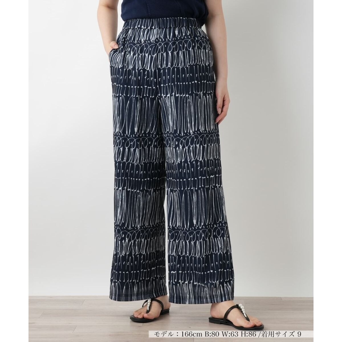 リズミカルな手描き風のライン柄のプリントが目を惹く、ユニークなデザインのワイドパンツ。ゆったりとしたシルエットに、総柄の大胆さをバランスよく溶け込ませた一本。ウエストまわりは総ゴム仕様でリラックスしたはき心地を叶えながら、すっきりとした印象に仕上げています。シンプルなカットソーやブラウスはもちろん、同素材のトップスやワンピースとのコーディネートも楽しめる主役級のアイテムです。