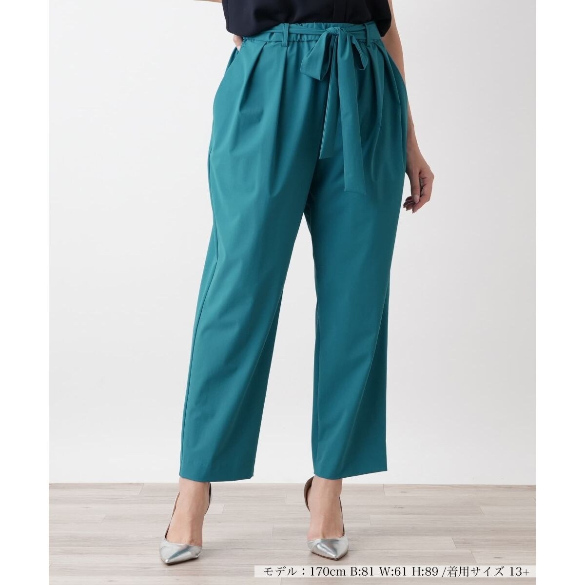 ナイロンにストレッチ素材をブレンドした生地を使用し、動きやすさと美しさを兼ね備えたペグトップパンツ。腿まわりに程よくゆとりをもたせながらも裾にかけてすっきり絞ったラインで、レッグラインをきれいに見せてくれます。取り外し可能なリボンベルト付きでトップスインもサマになります。同素材のアイテムと合わせれば、セットアップとしても楽しめる使い勝手抜群のボトムです。