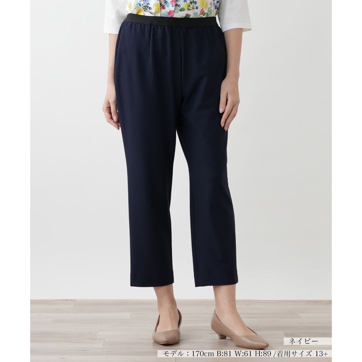 表面に凹凸感のある独特なニュアンスの生地で仕立てたクロップドパンツ。シャープに絞り込んだすっきりとしたシルエットでありながら、程よいリラックス感があり、季節らしい爽やかな印象に。ウエストは総ゴム仕様で心地よくフィットし、ストレッチ性のある生地が快適なはき心地をサポート。動きやすさも兼ね備えているので、デイリーからお出かけまで幅広く活躍します。トップスをタックインすれば、脚長見せのスタイルアップ効果も期待できそうです。