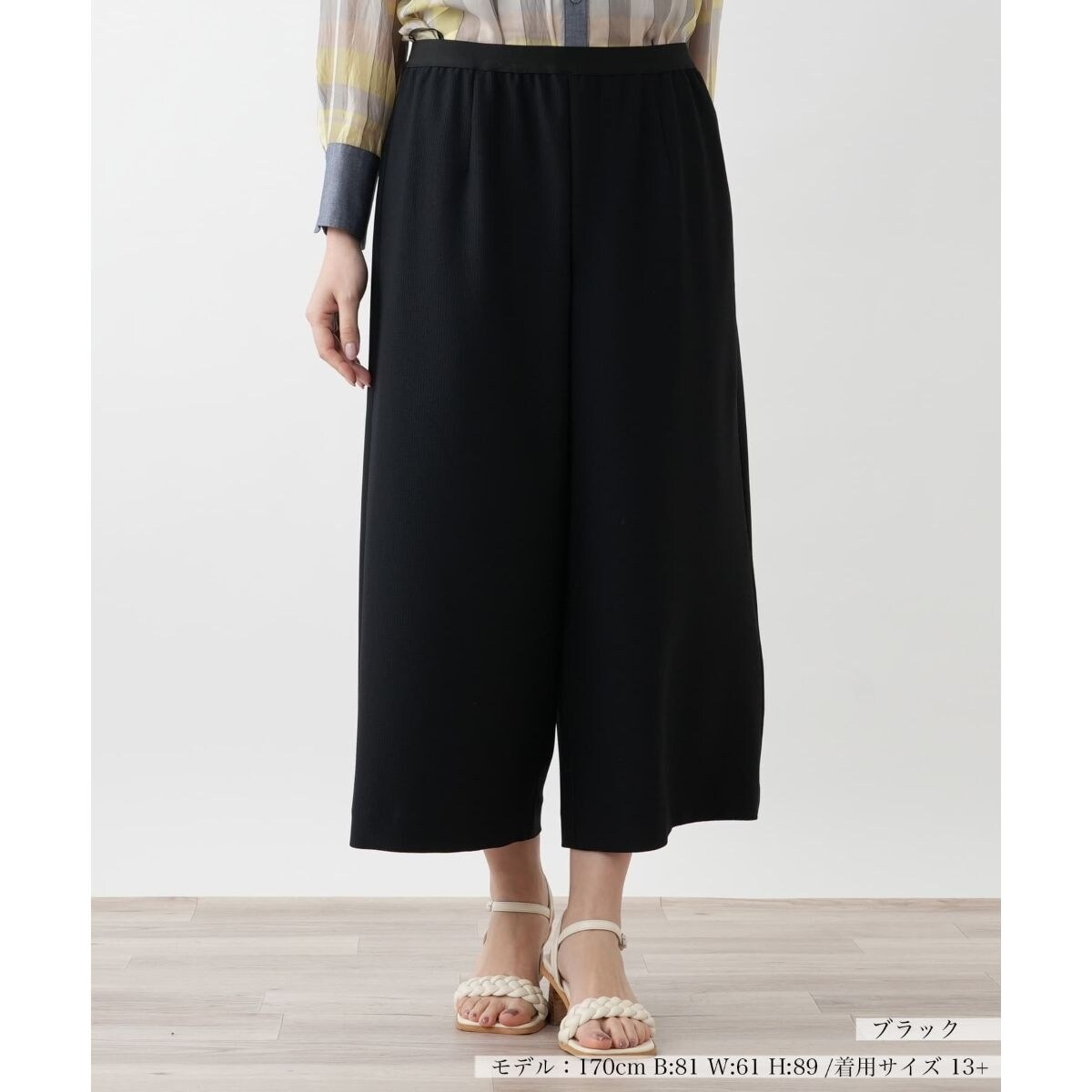 表面に凹凸感のある独特なニュアンスの生地で仕立てたガウチョパンツ。リラックス感漂うワイドシルエットながら程よい落ち感があり、大人の上品な佇まいを演出。ウエストは総ゴム仕様で心地よくフィットし、ストレッチ性のある生地が快適なはき心地をサポート。動きやすさも兼ね備えているので、デイリーからお出かけまで幅広く活躍します。トップスをタックインすれば、脚長見せのスタイルアップ効果も期待できそうです。