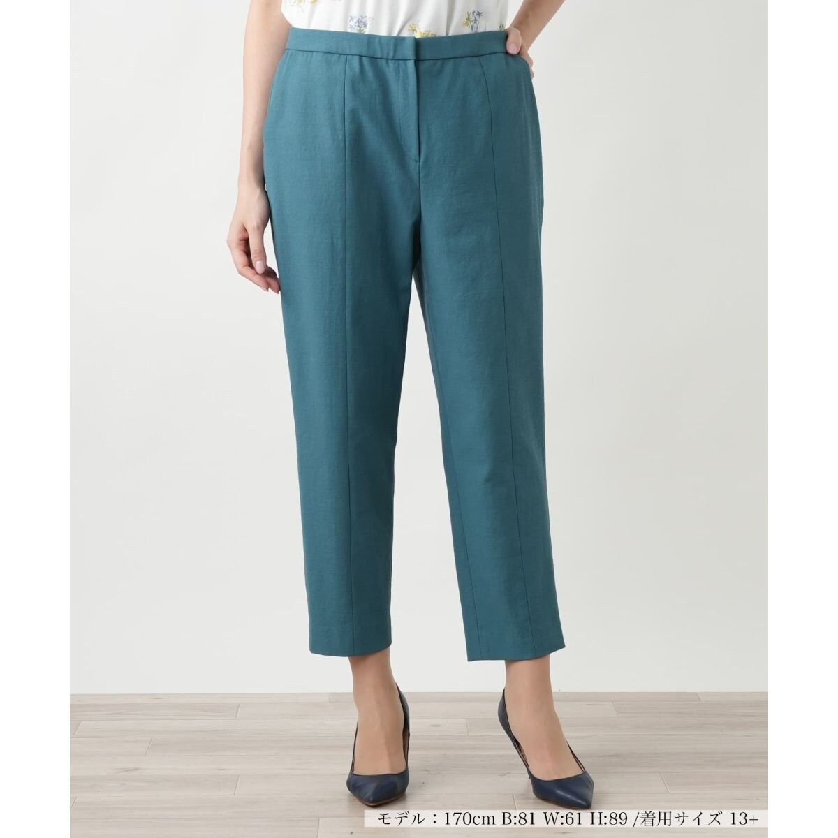 ポリエステルにコットン麻を混紡した素材を使用したテーパードパンツ。前後身頃には切り替え、後ろ裾にはスリット入りの細身シルエットですっきりとしたデザイン。