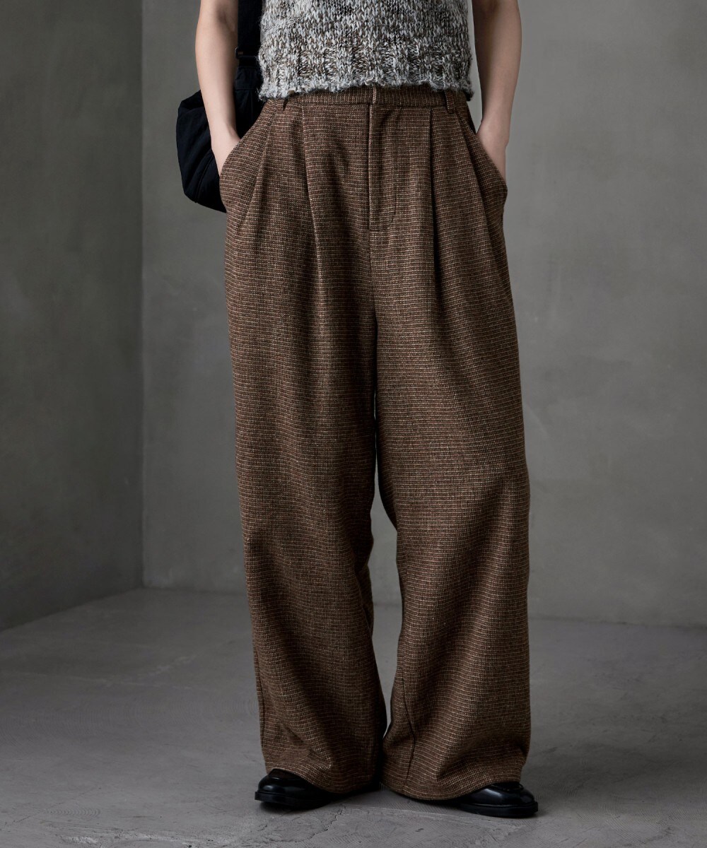 ウエストはすっきりと、前面にタックを施したワイドシルエットで腰回りのボリューム感をカバー。