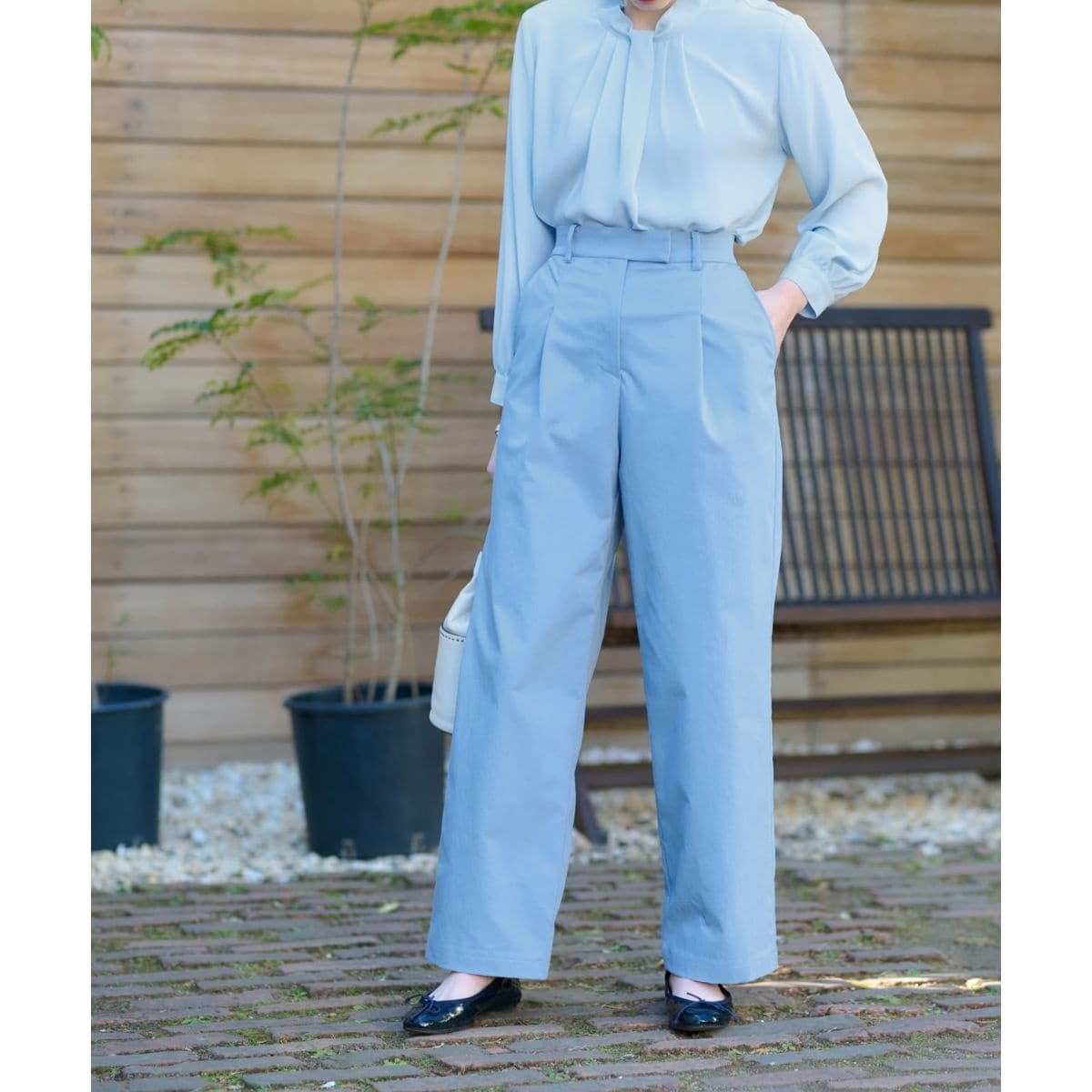 ワンタックを施し、程よいボリューム感を持たせたワイドストレートシルエットのカラーパンツ。レッグラインを拾いにくく、動きのある表情がこなれた雰囲気を演出。ウエストはゴム仕様となっており、締め付け感がなく快適なフィット感を実現します。生地はやや薄手で、軽やかな穿き心地をキープしながらも、程よい伸縮性を備えているため足捌きも良好。無駄な装飾を省いたミニマルなデザインで、トップスを選ばず幅広いスタイリングにマッチ。
