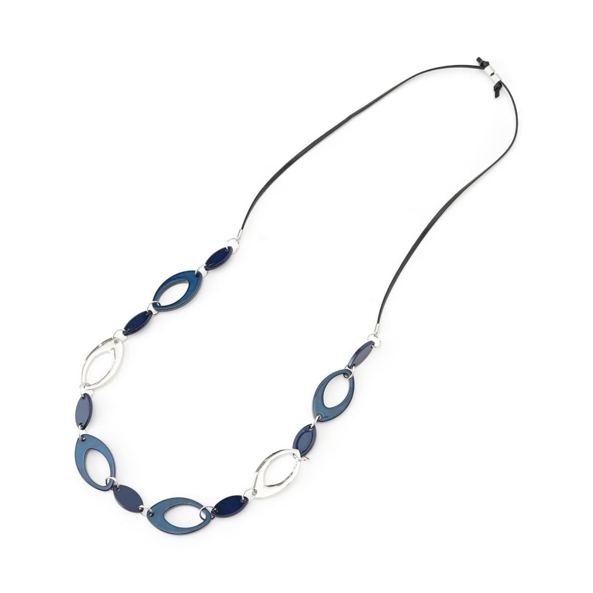 大ぶりのオーバルモチーフがリズミカルに連なる、モダンで存在感のあるロングネックレス。艶やかなカラーパーツと、シャープなメタルパーツの異素材ミックスが、胸元に洗練された抜け感のある表情をプラスします。シンプルなニットやワンピースに合わせるだけで、着こなしをぐっと華やかに格上げしてくれる、日本製のアクセサリーです。
