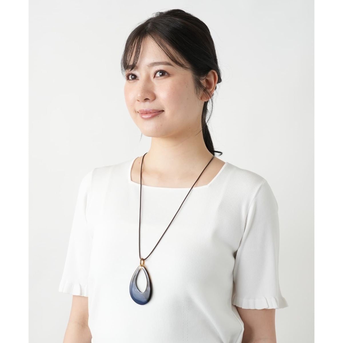 エレガントなドロップシェイプのモチーフが目を惹くコードネックレス。マーブル調の美しい質感に配色のアクセントを加えることで、モダンなエッジを効かせたデザインに仕上げました。さりげなく身に着けるだけでアートピースのような魅力を放つ、大人のためのアクセサリーです。コード部分はスライド式のアジャスターを備えており、シーンやスタイリングに合わせて長さの調整が可能です。
