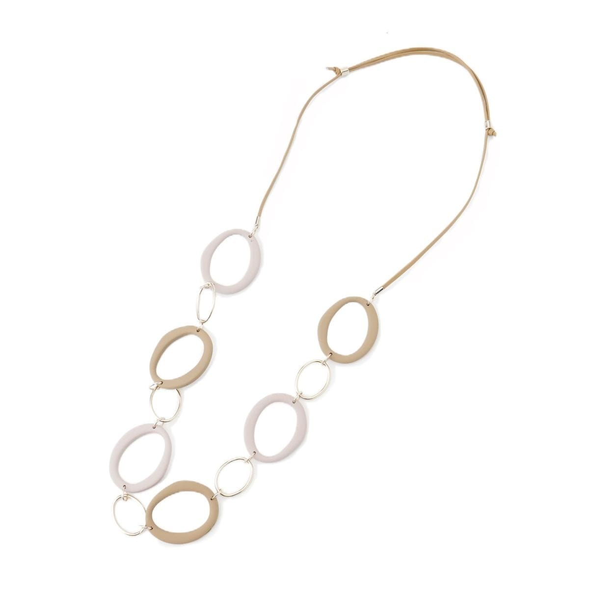 異素材のサークルモチーフがリズミカルに連なり、視線を惹きつけるコードネックレス。ボリュームたっぷりのデザインでありながら、モチーフの抜け感が絶妙で、春夏の装いに爽やかなアクセントを添えてくれます。ナチュラル&シックなカラーリングで肌なじみもよく、シンプルなトップスに合わせるだけで、ぐっとこなれた印象に。コード部分にはアジャスターを備えており、スタイリングに合わせて長さを自在に調整できます。