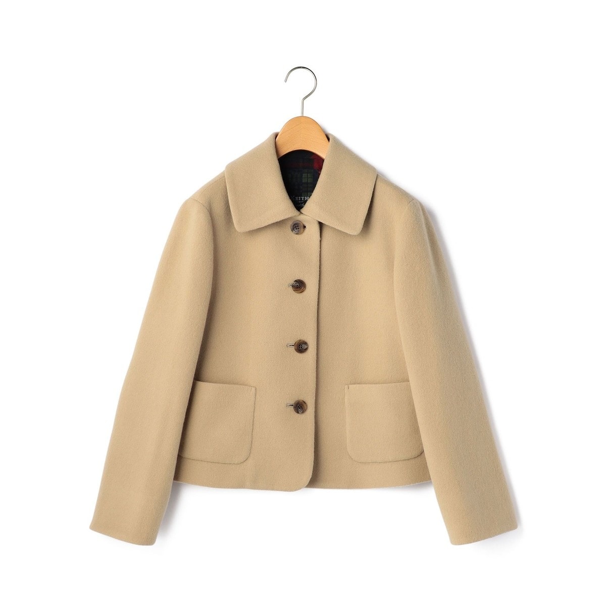 やわらかであたたかなライトビーバー生地で仕立てたジャケット。衿の裏地にチェック柄生地をあしらい、ブランドオリジナルの高級感あるボタンを配すなど、細部までこだわりを感じられるおしゃれなデザインが魅力。短めの丈感で着こなしやすく、さっと羽織れてエレガントなスタイリングが完成します。