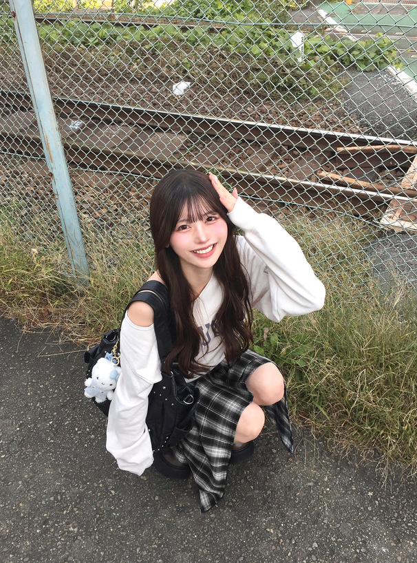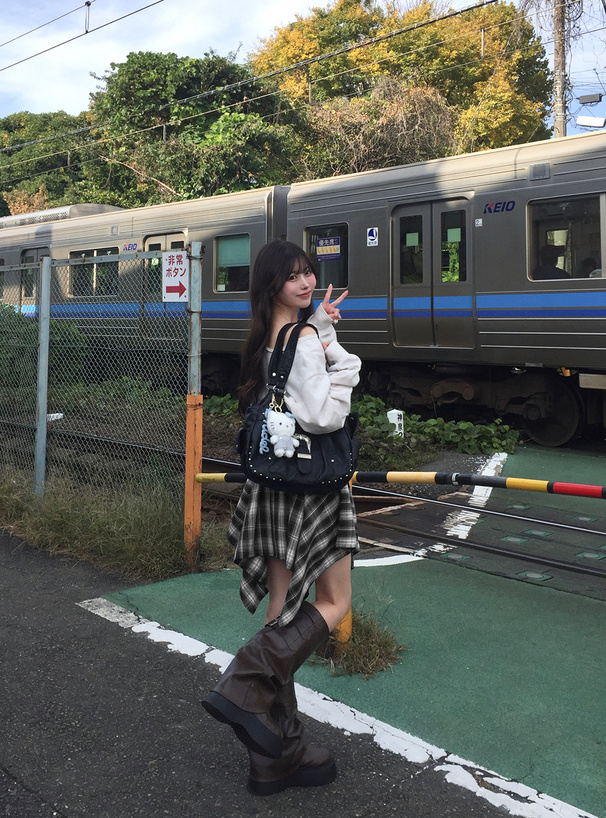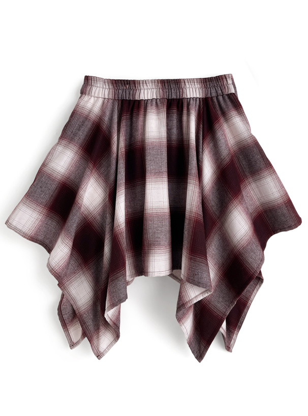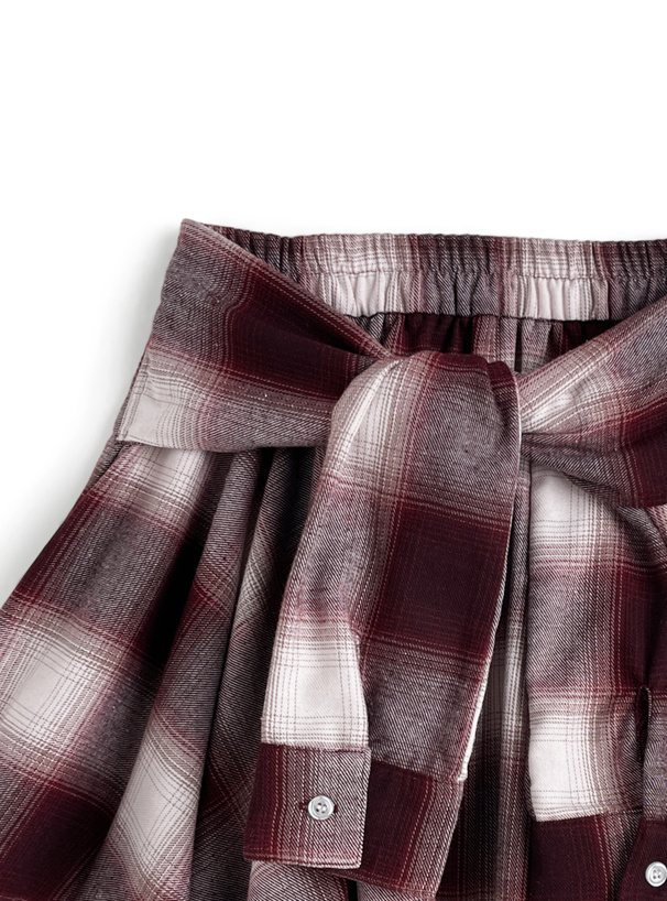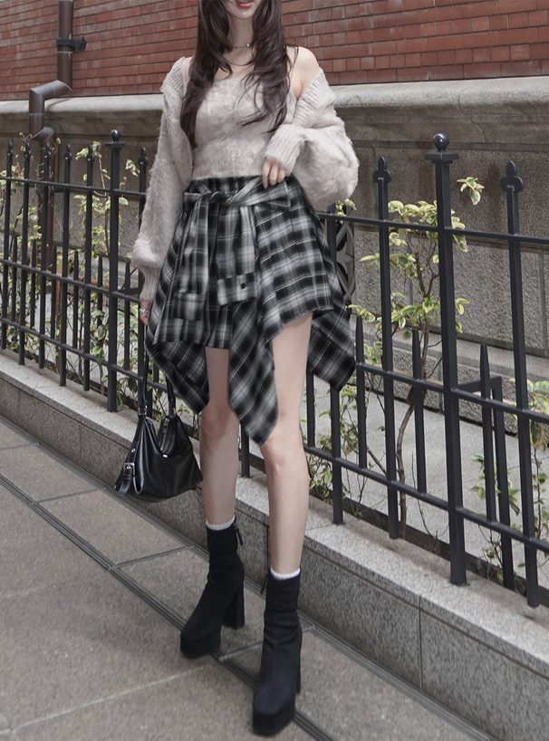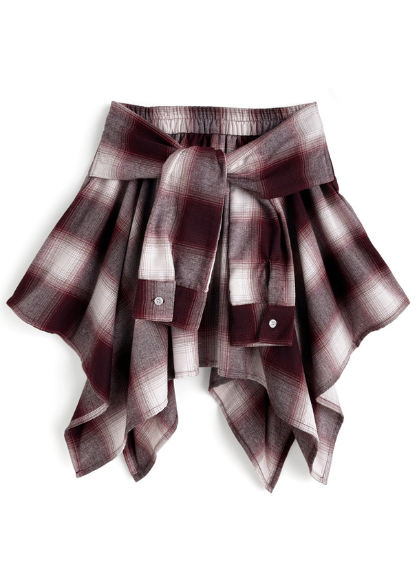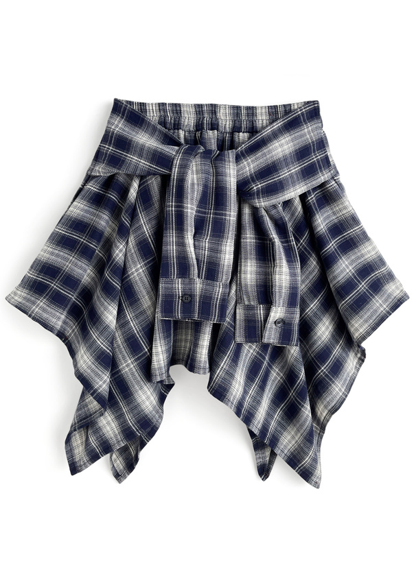 腰にシャツを巻いたようなデザインがユニークなチェック柄スカート。