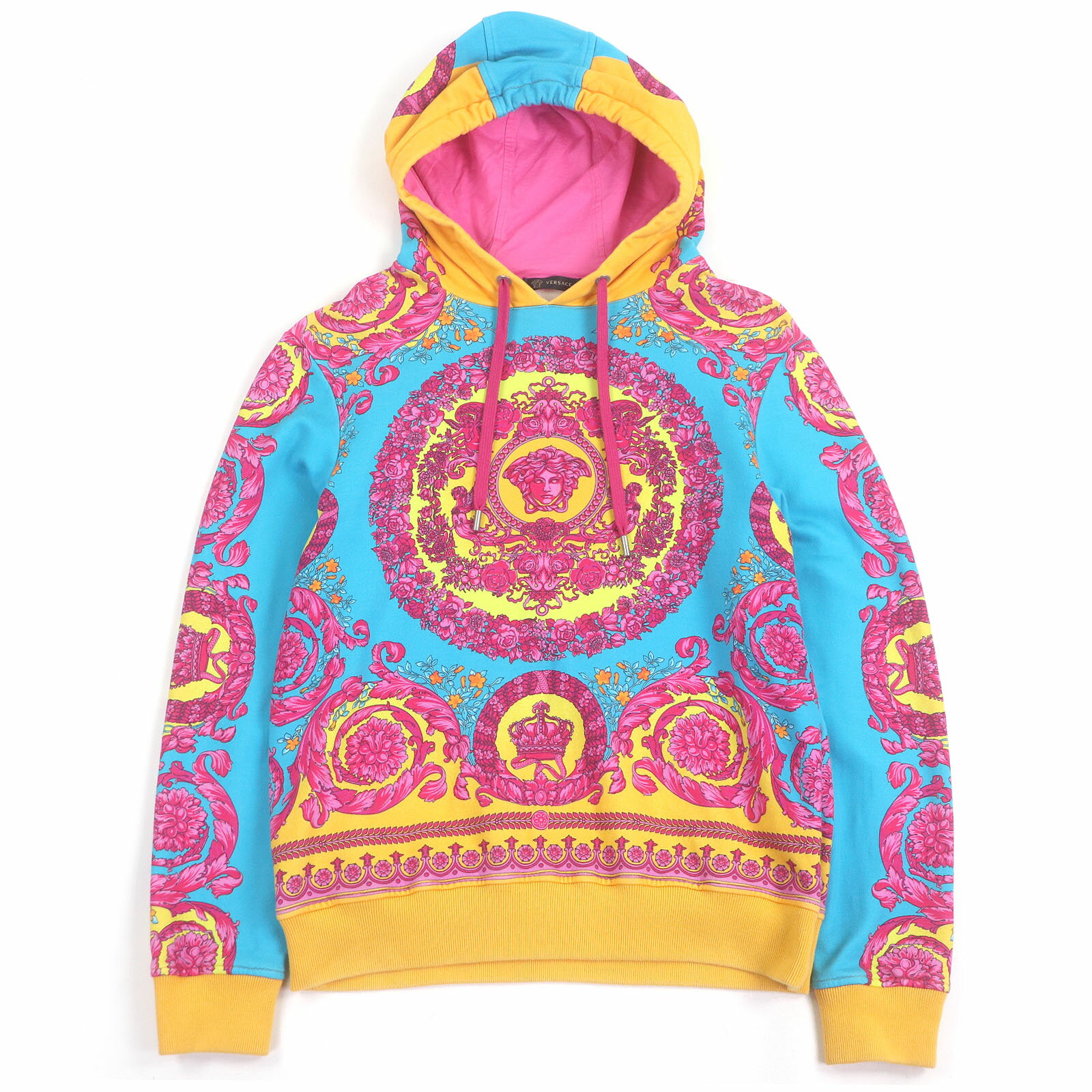 極美品▲VERSACE ヴェルサーチ コットン100% フロント ロゴビジュー プルオーバー パーカー ブラック S イタリア製 正規品 メンズ【中古】