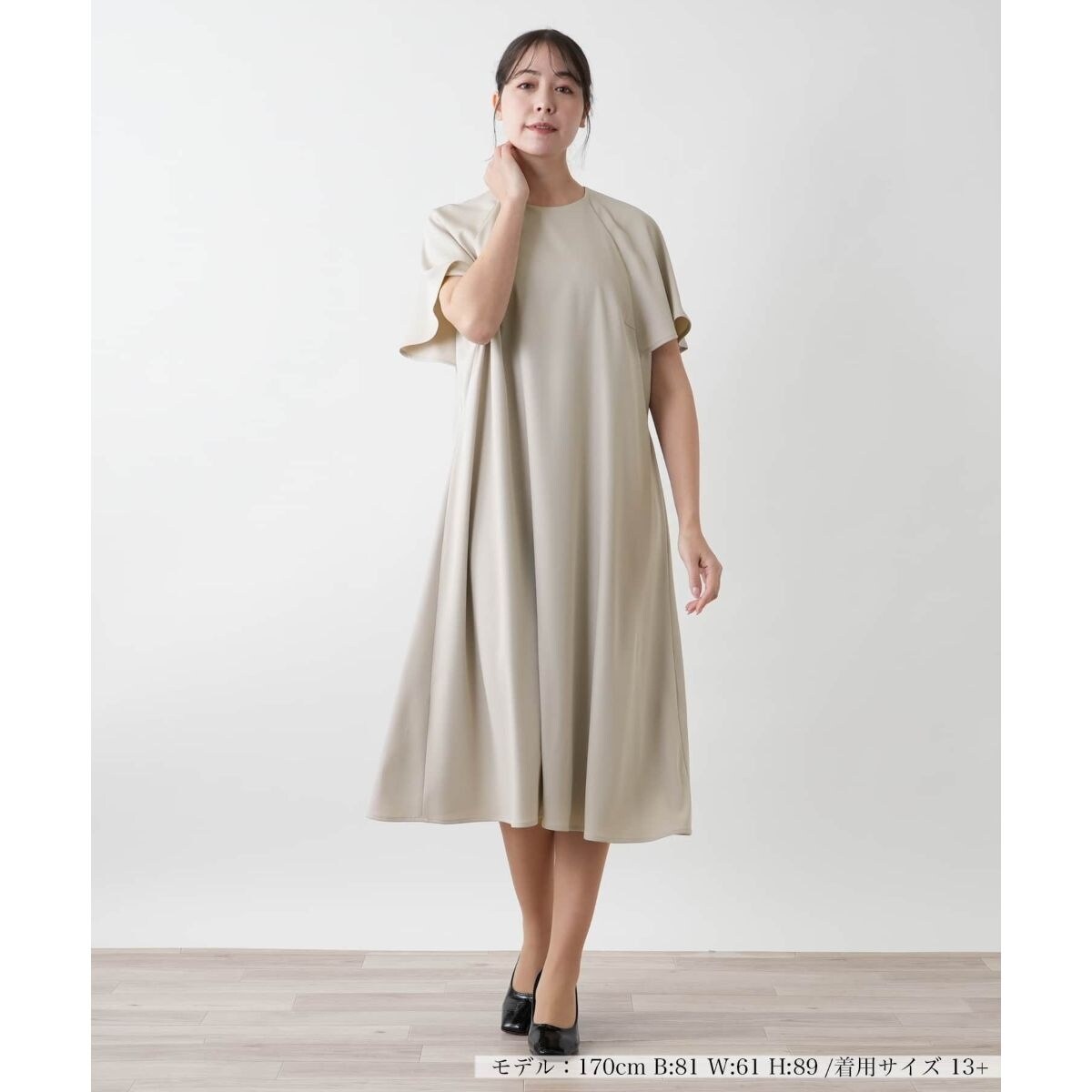 微細な光沢感をまとったやや薄手の生地で仕立てられた、膝上丈のフレアワンピース。袖や身頃には広がりを持たせており、動きに合わせてふわりと揺れるフレアシルエットが、リラクシーでありながらも洗練された雰囲気を演出。肩ラインはラグランカットでストレスフリーな着心地を実現しました。絶妙な丈感が足元を美しく見せ、ヒールからフラットシューズまで多彩なフットウェアと相性の良さを発揮します。バックにはファスナーが施されており、スムーズに開閉が可能。