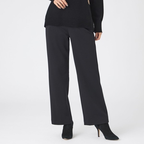 膝から裾まで真っすぐ落ちるストレートシルエット、一般的なワイドボトムよりも4-5cm程細いややワイドな裾幅のNEWシルエット。ワイドのニュアンス感や体型カバー力、ストレートのスッキリ感や合わせやすさをいいところ取りした万能ボトムです。ちょうどいいバランスがトップスの着丈を選ばず、着回しのきく優秀アイテム。素材のストレッチ性に加え、ウエストはゴム仕様なのでよりラクチンな穿き着心地です。