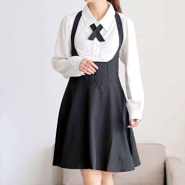 甘さたっぷりガーリーなスタイル、ブラウス&首掛けスカートのセットアップです。リボンタイ付きのブラウスは胸元にタック入り。立体感を生み、ふんわりとしたシルエットで上半身をやさしくカバー。首掛けのフレアスカートはハイウエストとフレアラインが脚をすっきり長く見せ。首掛けのストラップデザインが重心を上に引き上げ、自然に華奢な印象に仕上げます。それぞれ単品でも使えるので、デートやお出かけ、ちょっとしたイベントにもおすすめ。品よく可愛いを叶える主役級セットアップ、トレンド感のあるガーリーコーデが楽しめます。