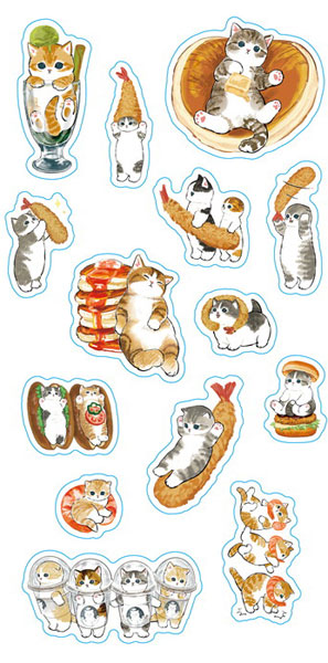InstagramやTwitterなどのSNSを中心に人気のイラスト作家ぢゅのさんが描く可愛いネコのイラスト「mofusand」。 キュートで少しシュールな姿のネコたちが特徴的です。 mofusandからクリアシールが発売!! 食べ物の姿を詰め込んだ展開です。