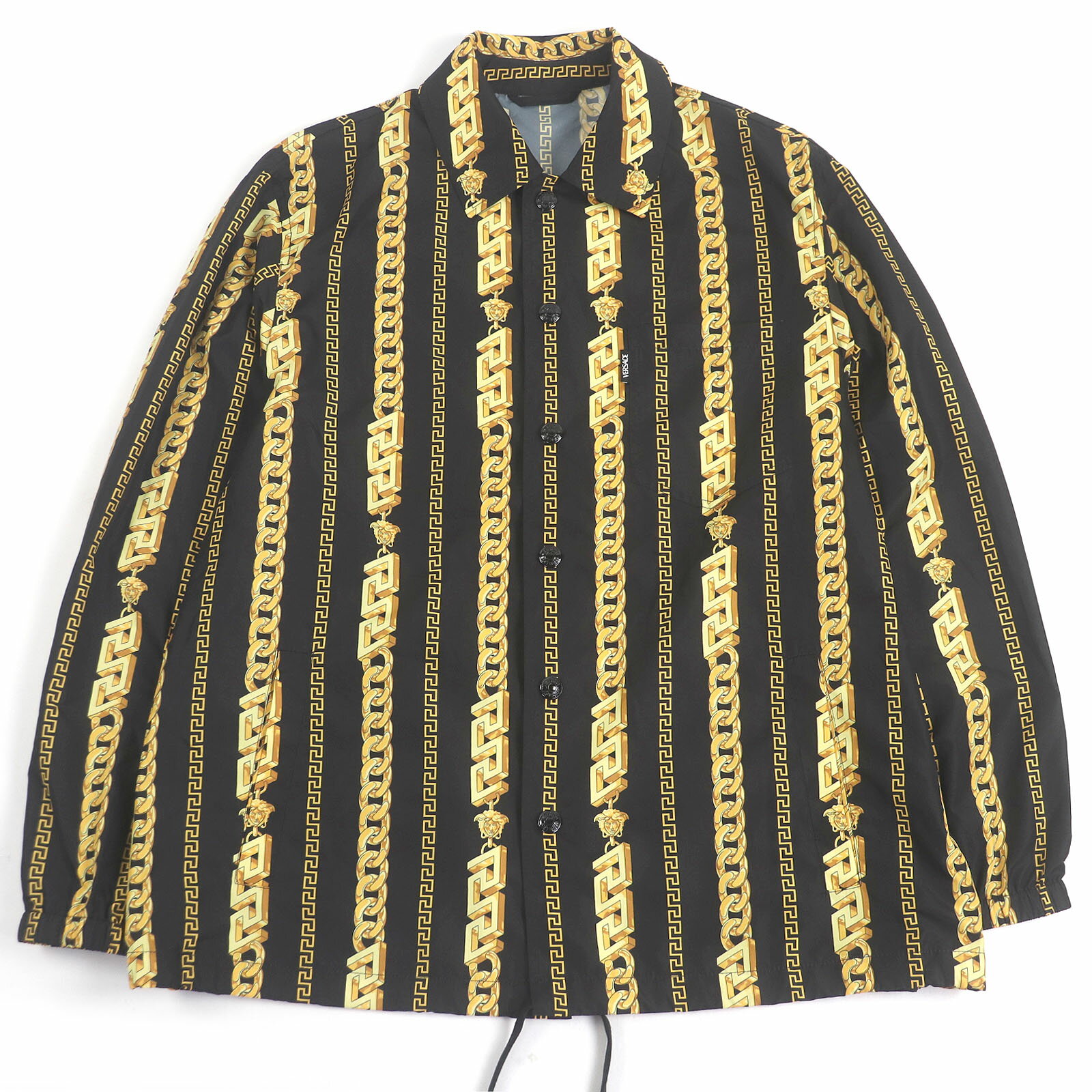 ■極美品■VERSACE ヴェルサーチ ネクタイ スカーフ柄 ドット 黄金装飾 総柄 シルク100% 日本製 ゴールド×ブラック他 ビジネス