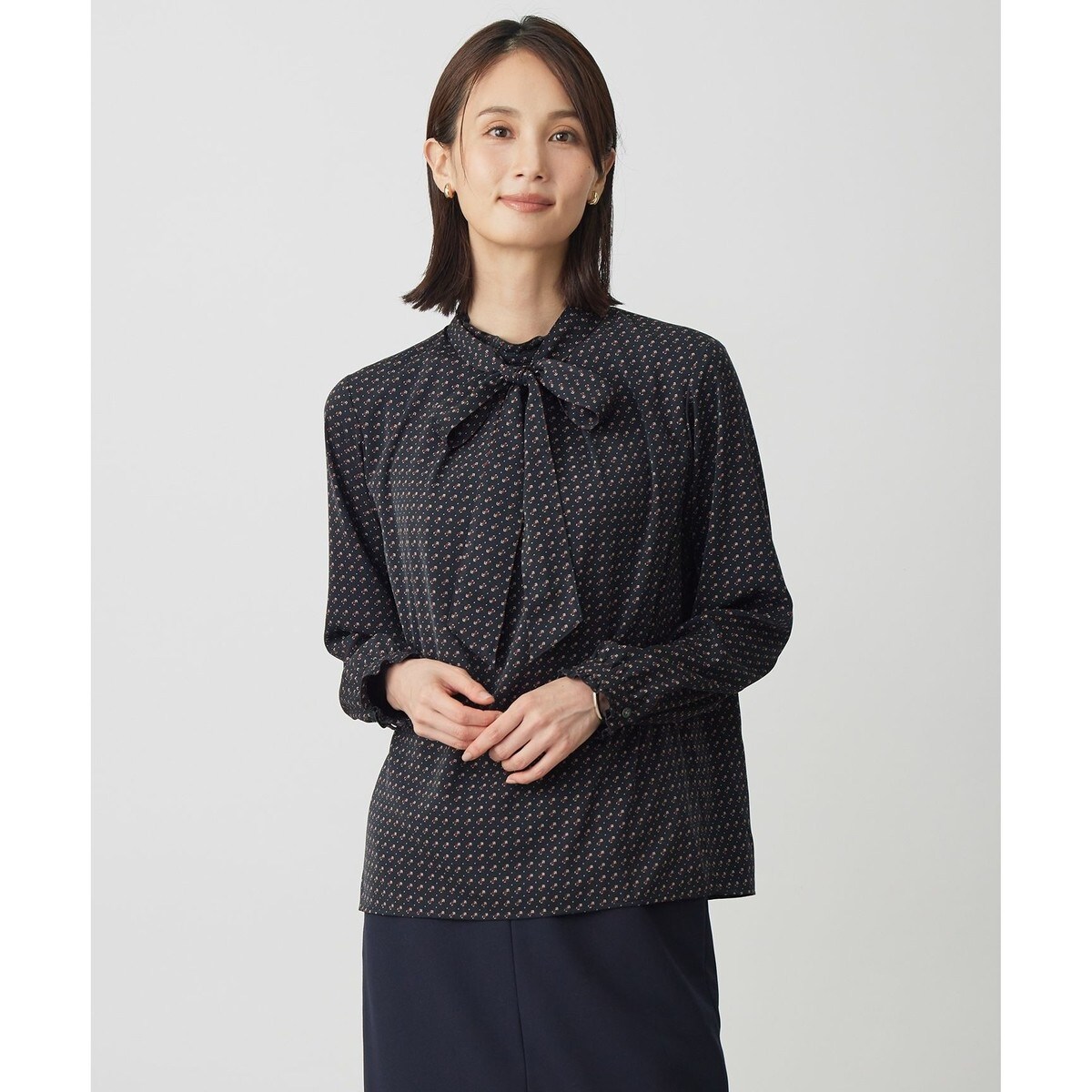 共布のリボンで印象を変えられる、幅広いシーンで着まわしやすい幾何柄ブラウス
