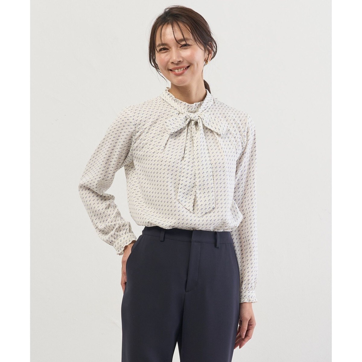 ■デザイン襟と袖のフリルが女性らしさを引き立てるブラウス。襟元にギャザーを寄せ、柔らかな雰囲気に仕上げました。共布のリボン付きで華やかさをプラスし、コーディネートのアクセントとしてもお使いいただけます。リボンは取り外し可能なので、その日の気分やスタイリングに合わせてアレンジ可能です。1枚着はもちろん、ニットにレイヤードしカジュアルに、ジャケットに合わせてきれいめになど幅広く対応できるアイテムです。カラーは、明るく清潔感のあるオフ(#501)、シーンレスに活躍するネイビー(#575)の2色展開です。