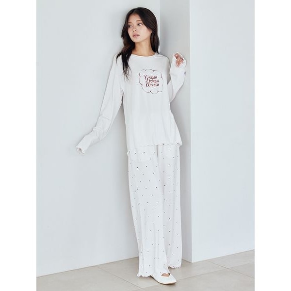 HOLIDAYシーズンの幸せな気分を表現した、季節感のあるカットソーシリーズです。裾にメローステッチを入れたロンパンツは、カジュアルに寄りすぎないフェミニンな存在感。柔らかな肌触りのカットソーは裏側が微起毛になっているので、寒い季節にも温かく着用いただけます。左腰にワンポイントでプリントを入れました。色はオフホワイトとレッドの2色展開。同シリーズのロングTシャツとセットアップで着用いただけます。