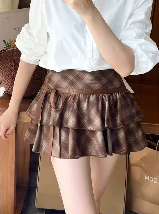 シックなチェック柄生地のフリルが印象的なミニスカート。