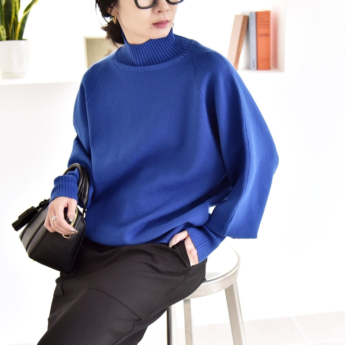 ゆったりとしたオーバーシルエットで楽に着られるタートルニット。