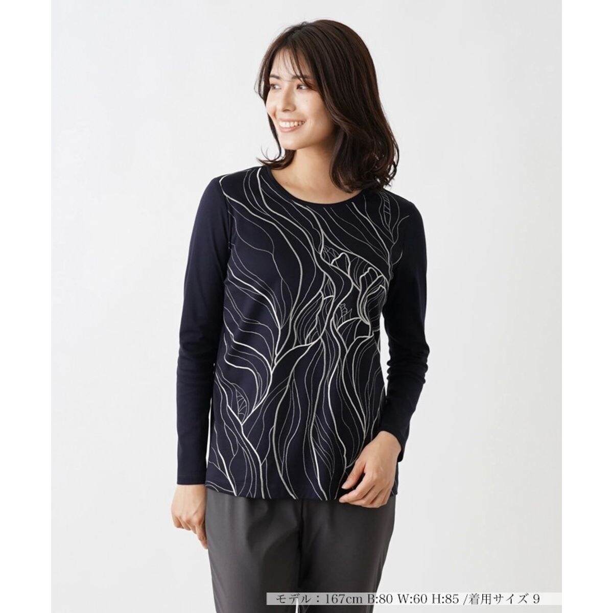 フロントにボタニカルモチーフの刺繍を施したクルーネックカットソー。ネックラインに開きをもたせ、絶妙なバランスの抜け感を演出。すっきりとしたシルエットでスマートに着こなせます。やや薄手のコットン生地を使い、爽やかな着心地を叶えました。落ち着いたシックな色合いで合わせやすく、一枚での着用はもちろん、ジャケットやカーディガンとのレイヤードスタイルでも活躍する使い勝手のよいトップスです。