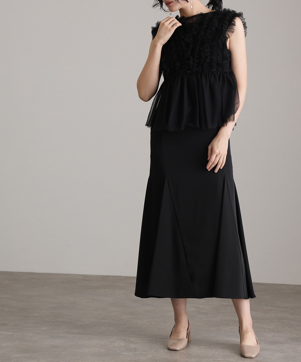 マーメイドラインスカートが、動くたびに揺れて華やかさを演出します。