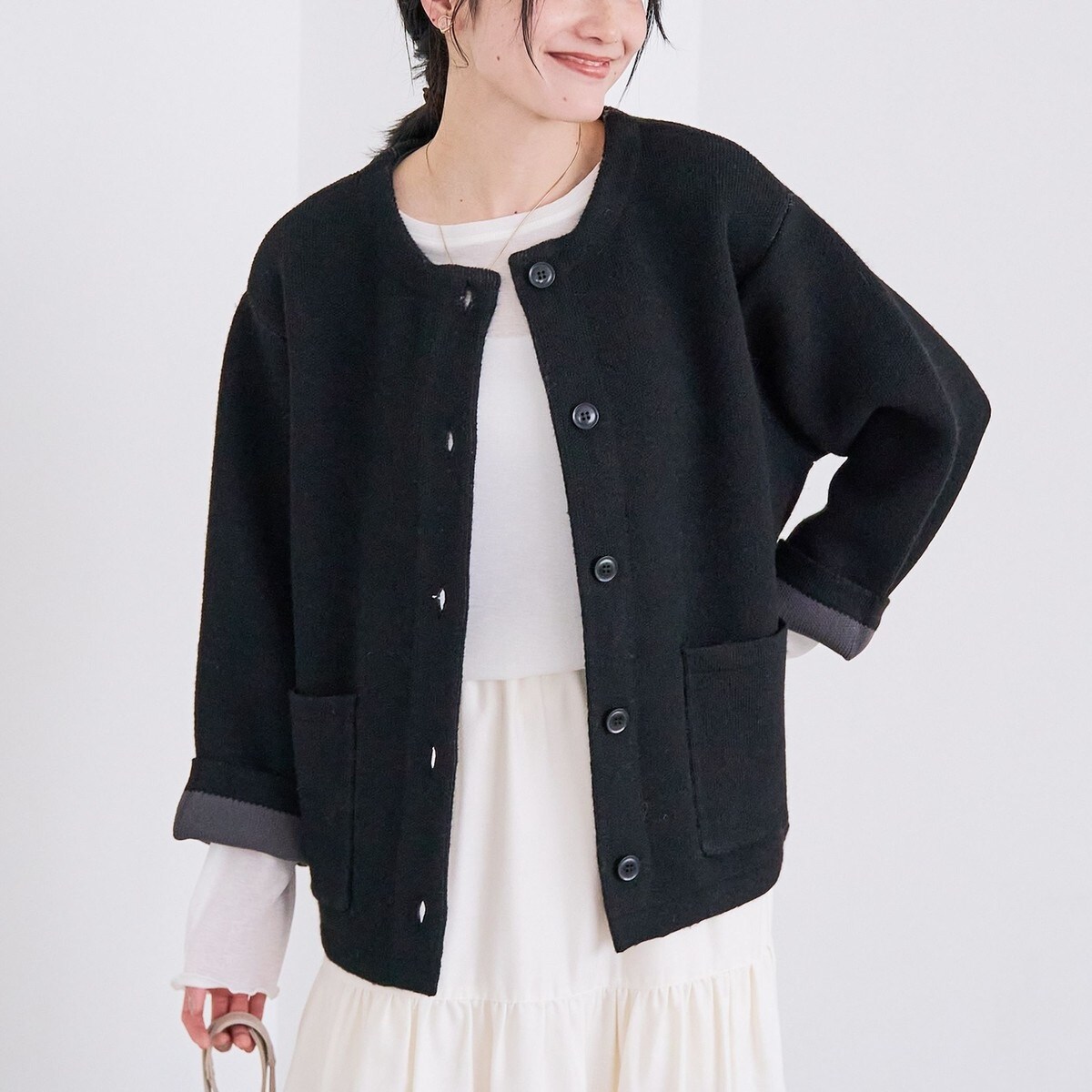 シンプルなクルーネックに前開きのベーシックなフォルムながら、