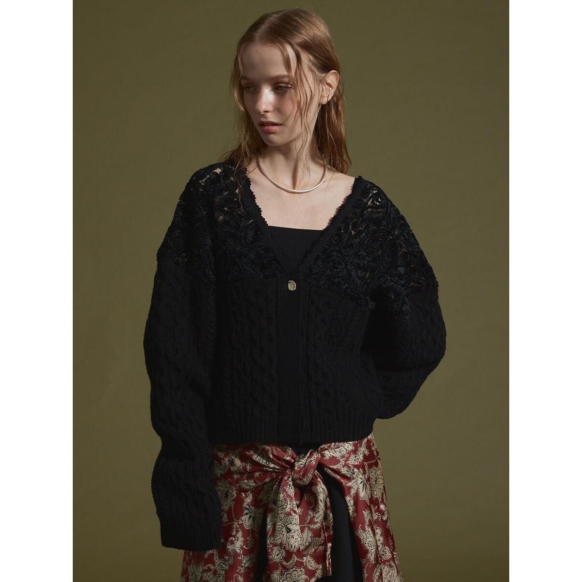 温もりのあるアラン柄ニットと、レースのコンビネーションが目を惹くカーディガン。