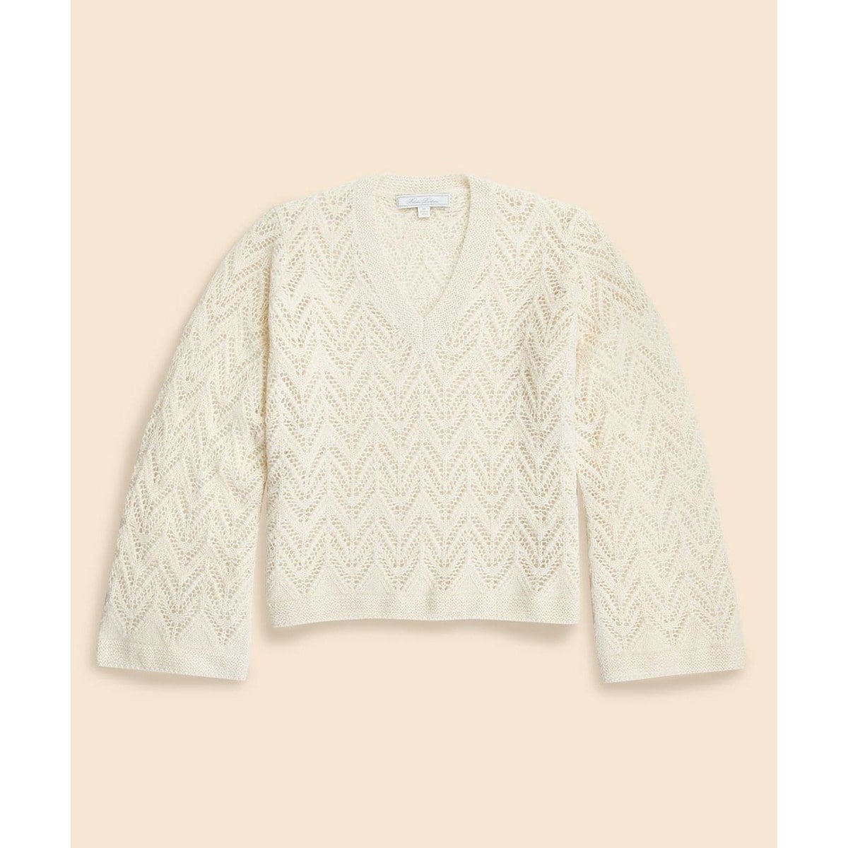 レース編みのような装飾的な透かし模様と袖口にかけて緩やかに広がったベルスリーブが、上品な甘さを醸し出します。フェミニンなスカートスタイルでロマンチックにお召しいただくのはもちろんのこと、デニムパンツやワイドパンツを合わせてメンズライクな要素とのコントラストを効かせたコーディネートもお薦めです。