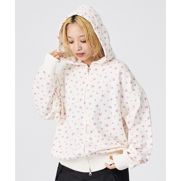 ふんわりと柔らかな肌触りのガーゼ裏毛素材で仕上げた花柄フルジップパーカー。