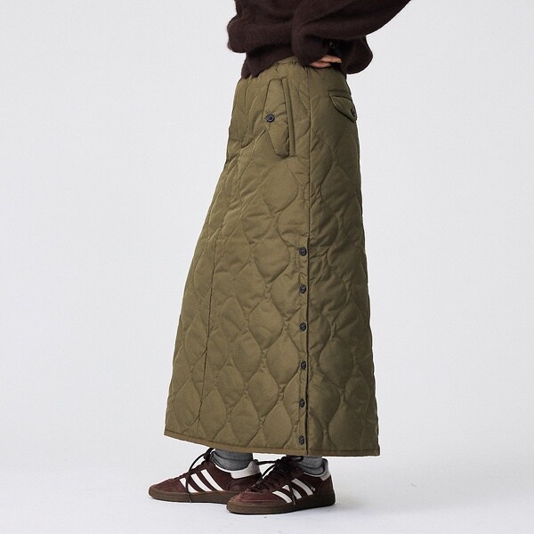 スパッツやパンツとの重ね着もお勧めな、暖かく履き応えのある、ミリタリーテイストのダウンスカートです。