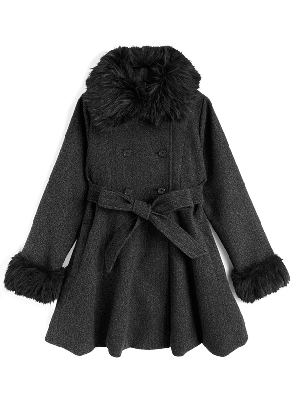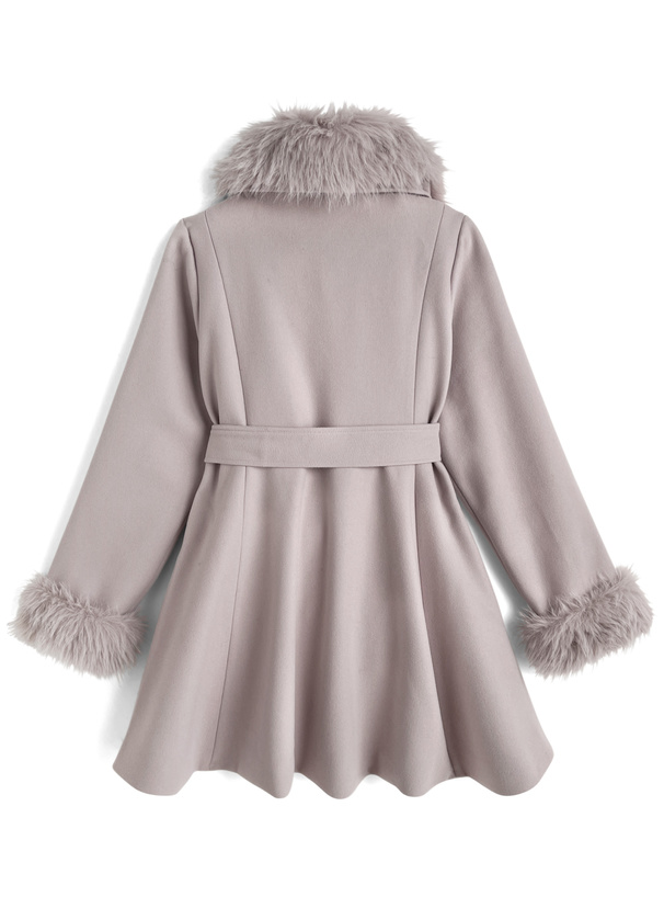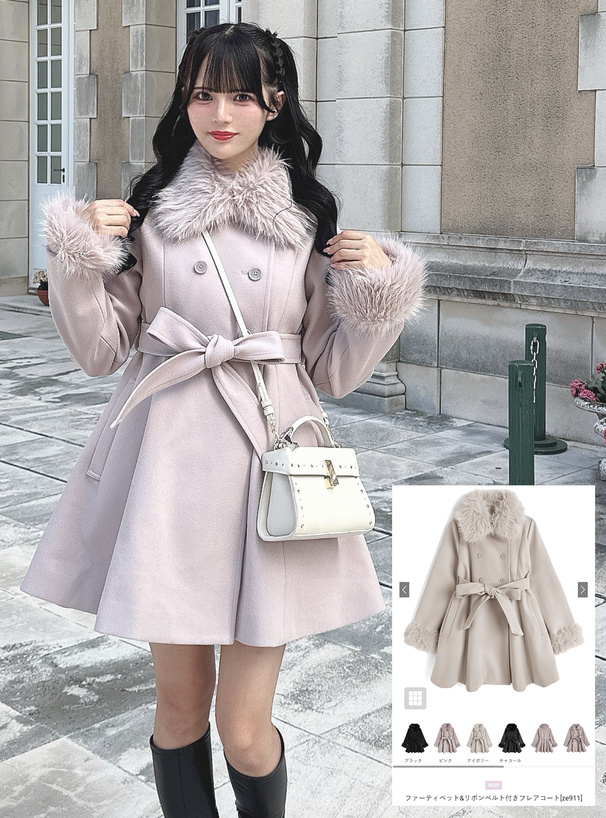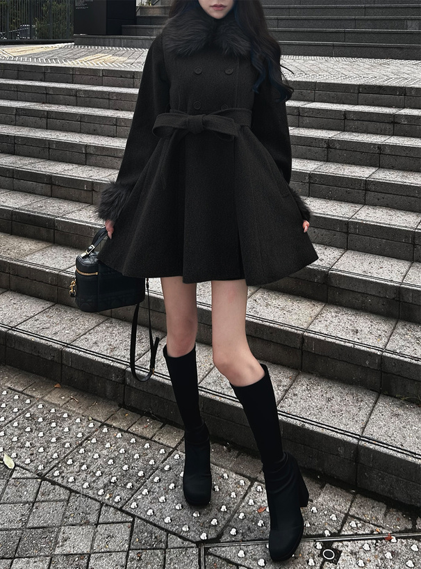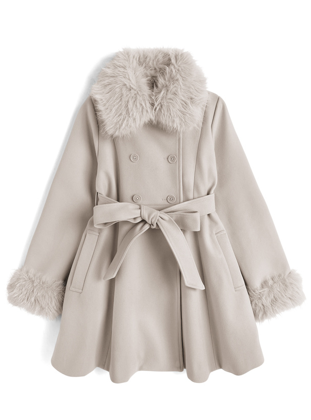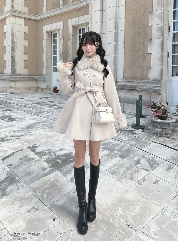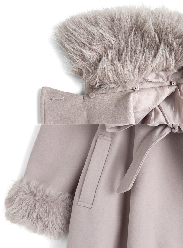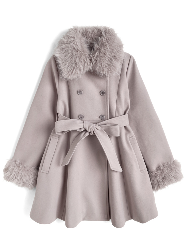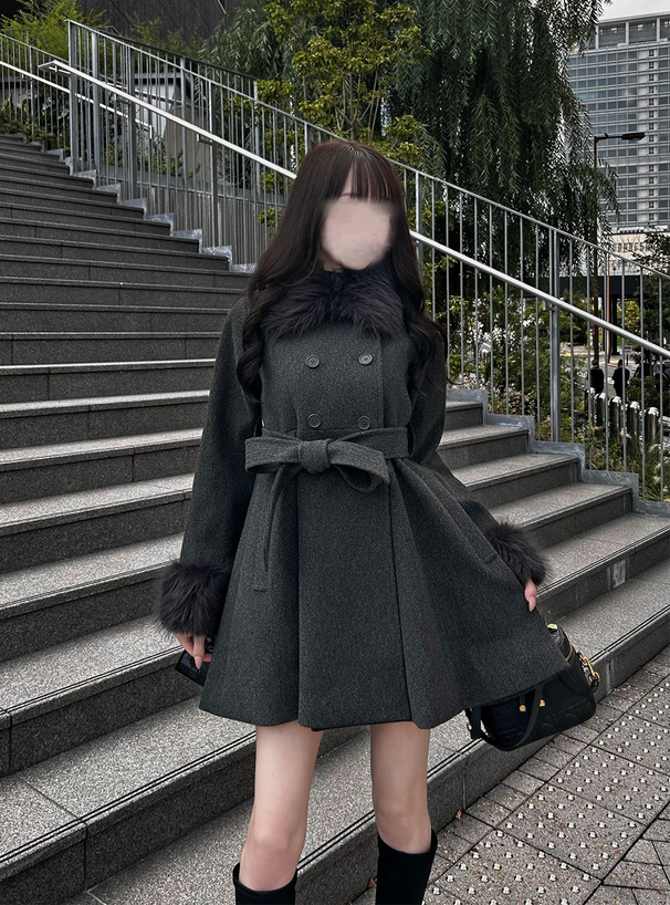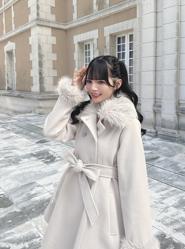 襟と袖口にあしらったふわふわのエコファーが目を惹く、フェミニンムードたっぷりのコート。