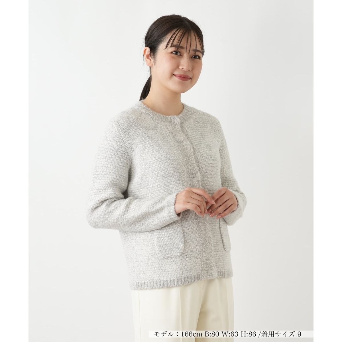 ミックス糸に繊細なスパンコールを編み込んだジャケットライクなニットカーディガン。ネックラインは顔周りをすっきりと見せ、フロントはスナップボタン仕様のため着脱もスムーズ。伸縮性のあるやや厚手の柔らかなニットの風合いが季節のコーデに温かみをプラス。両サイドにあしらわれたパッチポケットが、程よいアクセントと利便性を添えています。ボタンを留めてプルオーバー風に着こなしたり、ワンピースにさっと羽織ったりと幅広く活躍する一着です。