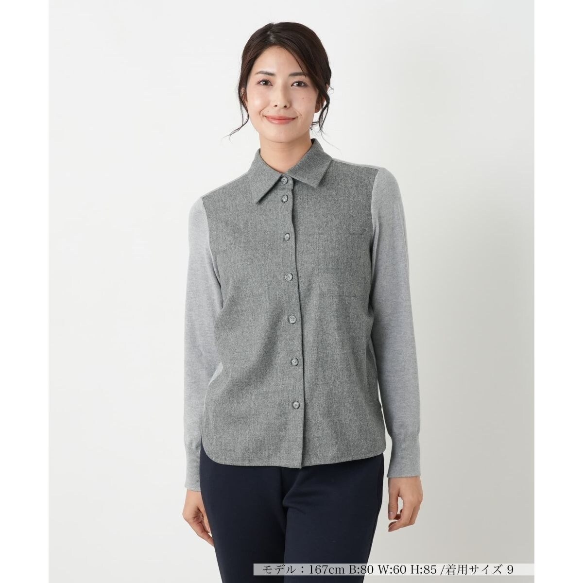 前身頃をメルトン調の暖かみある織地で、袖と後身頃を柔らかなニットで切り替えた、異素材コンビネーションが目を惹くブラウスです。襟付きシャツのようなきちんと感と、ニットトップスならではのリラックスした着心地を両立しました。胸元のポケットがさりげないアクセントになり、裾のサイドスリットが軽やかな抜け感をプラスします。ボタンを留めて着るのはもちろん、羽織りとしても活躍する一着です。