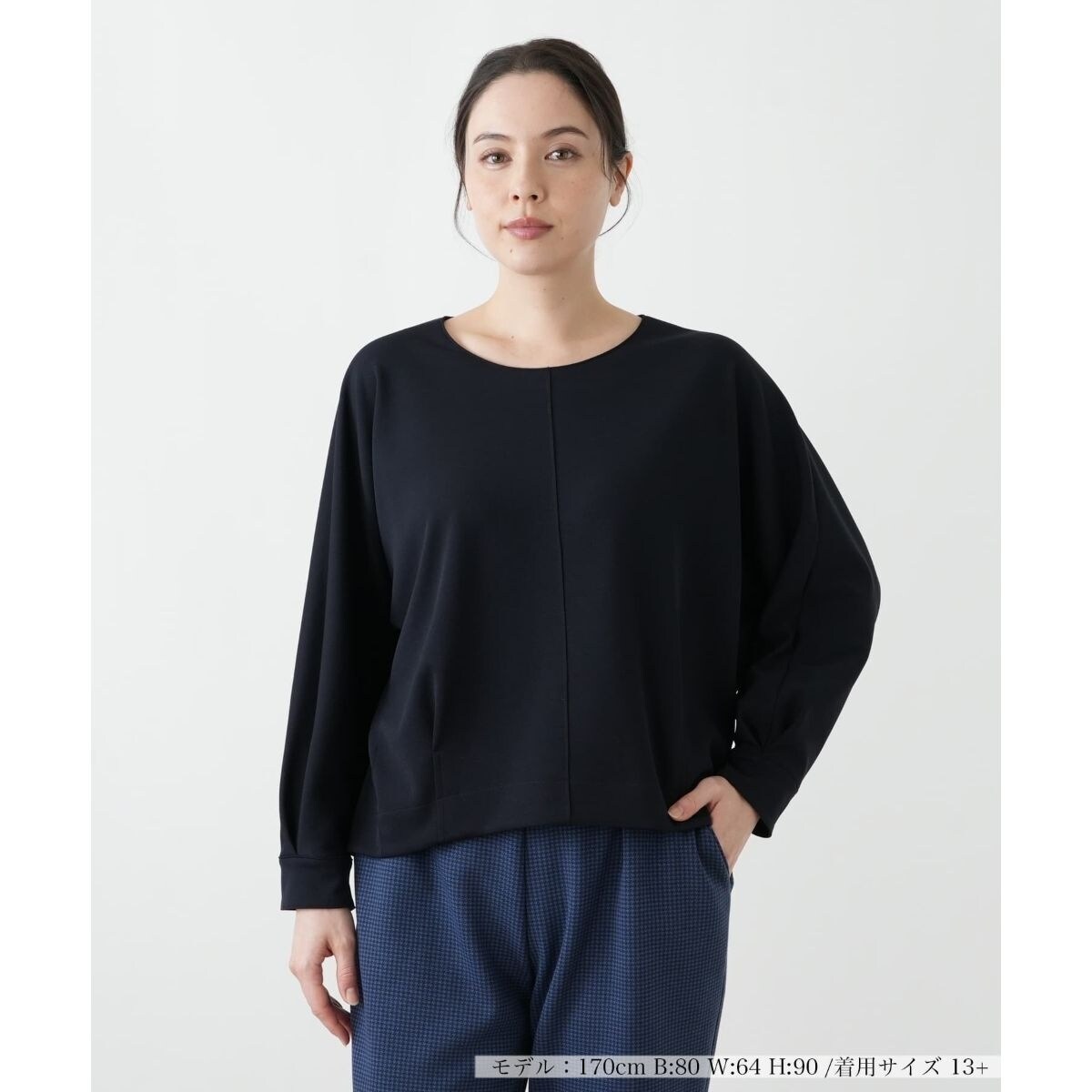 しなやかなドレープが美しい、滑らかな質感のプルオーバーです。程よい光沢感が上品な印象を与え、カジュアルながらもきれいめに着こなせます。デコルテを美しく見せる緩やかなネックラインと、肩の切り替えがないゆったりとしたドルマンスリーブが、リラックス感のある着心地と体型カバーを両立。袖口と裾はリブ仕様で、シルエットにメリハリをプラスします。後ろには、着脱しやすいファスナーがあしらわれ、リボンテープの引き手がデザインのアクセントになっています。日常使いから少しきれいめなシーンまで、幅広く活躍する一枚です。