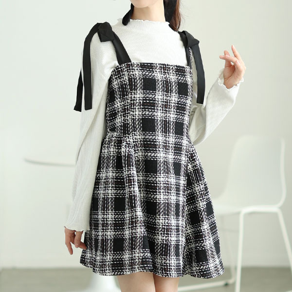 女の子らしさと上品さを両立したトレンドライクなミニ丈ワンピースです。肩紐の太めリボンは結び方を調整でき、バックファスナーで着脱もスムーズ。前後ともにスクエアネックがデコルテをすっきり魅せ、顔まわりを明るく印象づけます。上半身は程よくフィットし、ウエストからふんわり広がるフレアシルエットが自然にスタイルアップ。脚長見えの高めのウエスト位置と、軽やかに揺れるミニ丈が全身バランスを美しく演出します。上品なツイードを使用し、シーズンムードを高めながらも軽やかな着心地を実現。裏地付きで透けにくく、長時間着ても快適に過ごせるのも嬉しいポイント。デートや女子会などのきれいめカジュアルシーンにおすすめです。