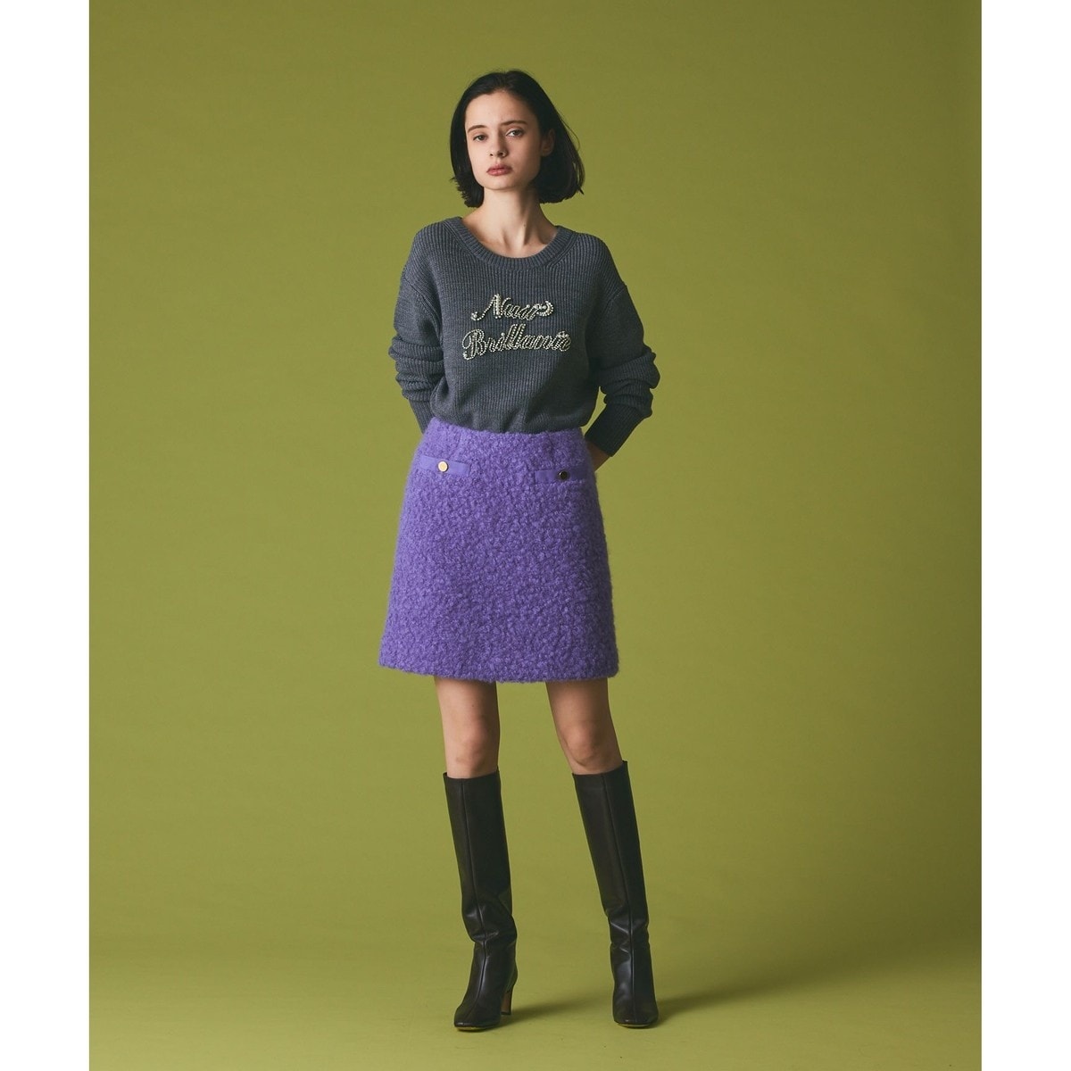 インポートならではの上質な素材で丁寧にお作りした、美しい佇まいのミニスカート。イタリアのCARMIGNANO(カルミニャーノ)社の柔らかく上質感のあるモヘヤリングウールを贅沢に使用。素材の可愛さを活かしたシンプルなデザインに艶めくゴールドのボタンがさりげなく存在感を放つ、シーズンムードを引き立てるデザインです。旬な装いに導いてくれるデイリーの定番兼主役アイテム。コーディネートに映える美しいカラーも魅力的な一品です。