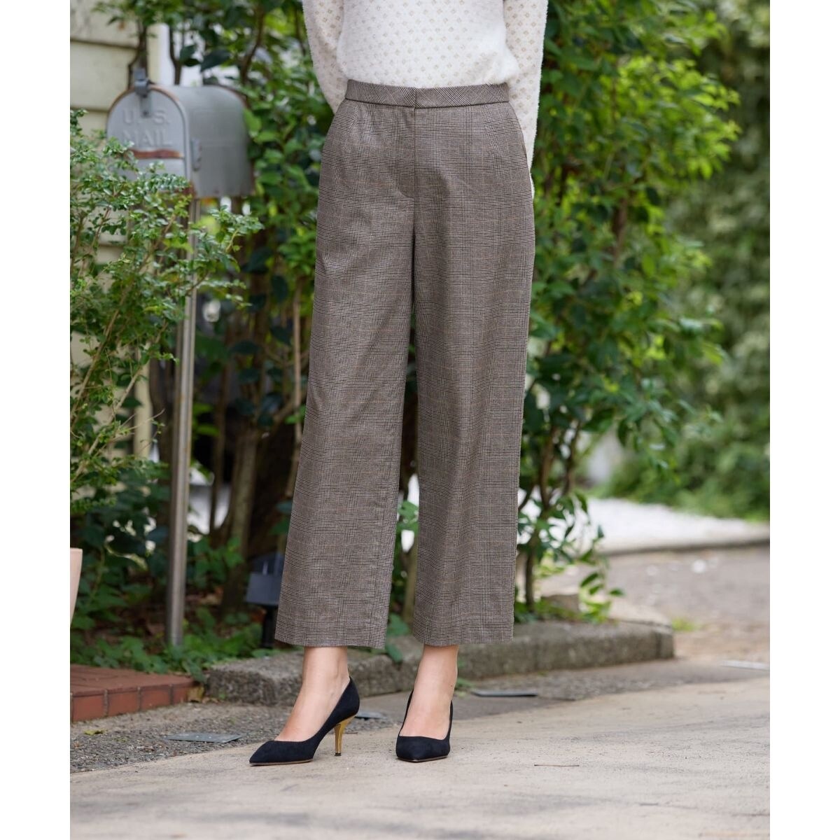 トラッドなチェック柄が上品な印象を与える、クロップド丈のパンツ。