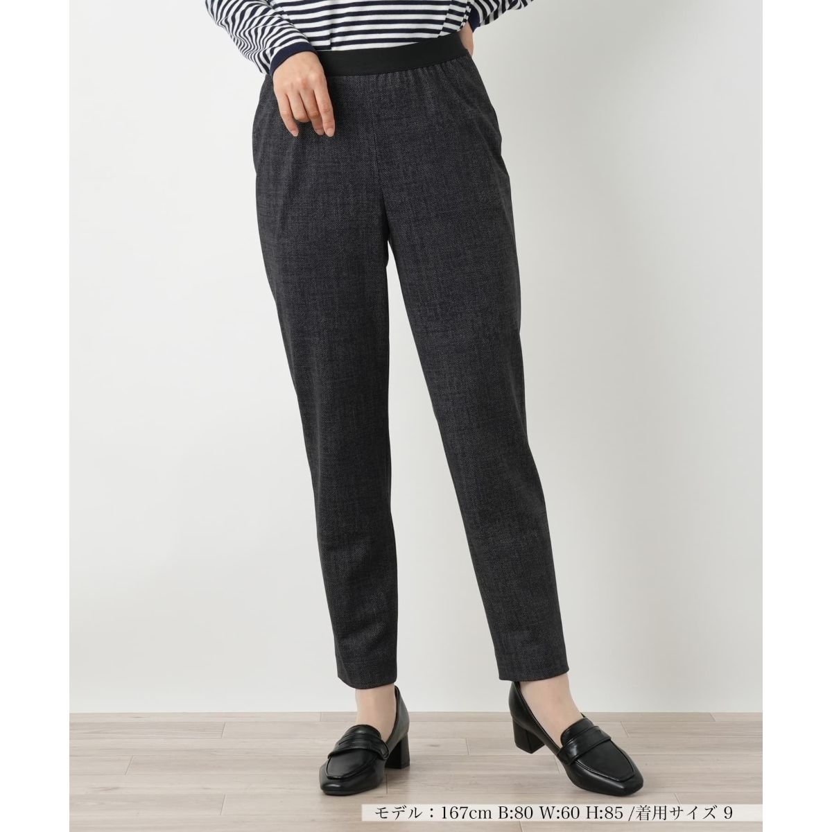 デニムの綾織り柄をリアルなプリントで表現したスリムパンツです。ウエストは総ゴム仕様で、着脱しやすく快適な穿き心地を実現。伸縮性に優れたストレッチ素材がレッグラインに程よくフィットし、すっきりとしたシルエットを描き出します。やや薄手の生地ですが、チュニックやワンピースとのレイヤードスタイルにも重宝しそうです。デニムのカジュアルな見た目と、リラックス感のあるイージーな穿き心地を両立したデイリーユースにぴったりの一本です。