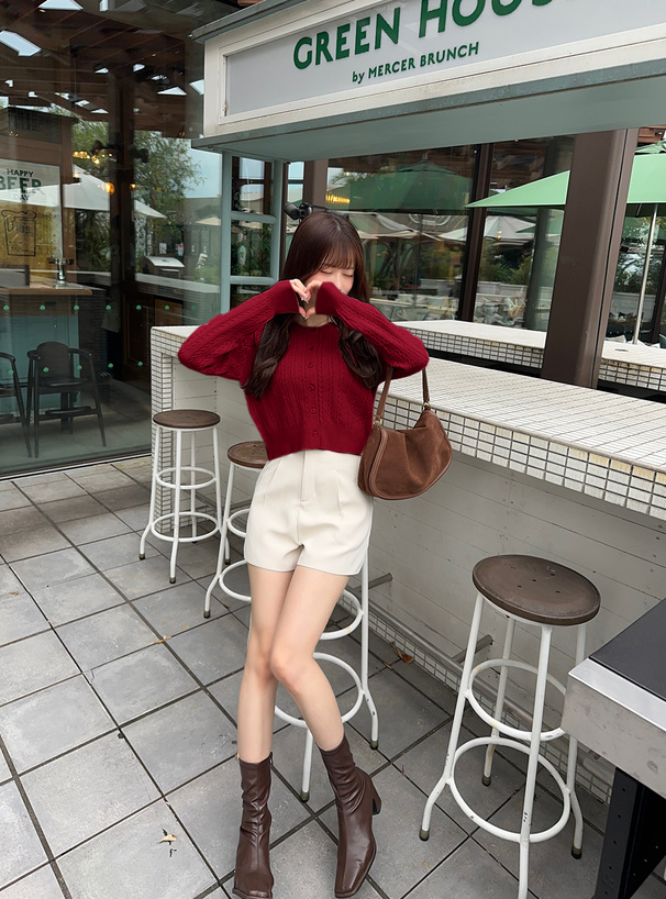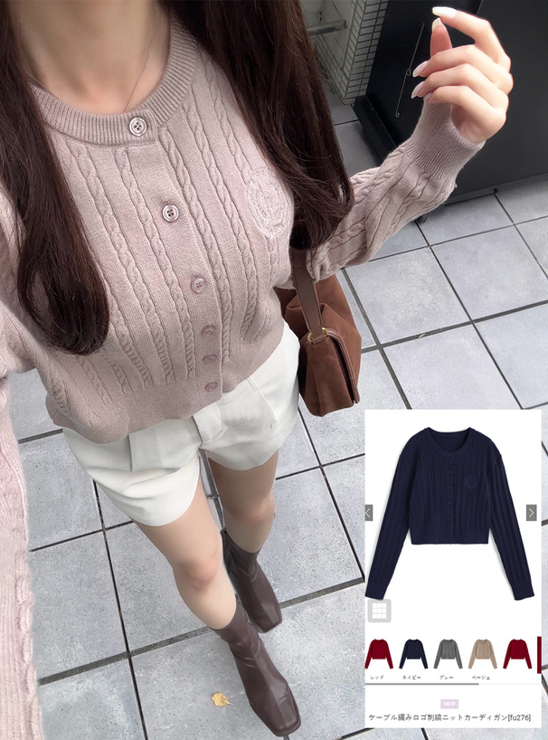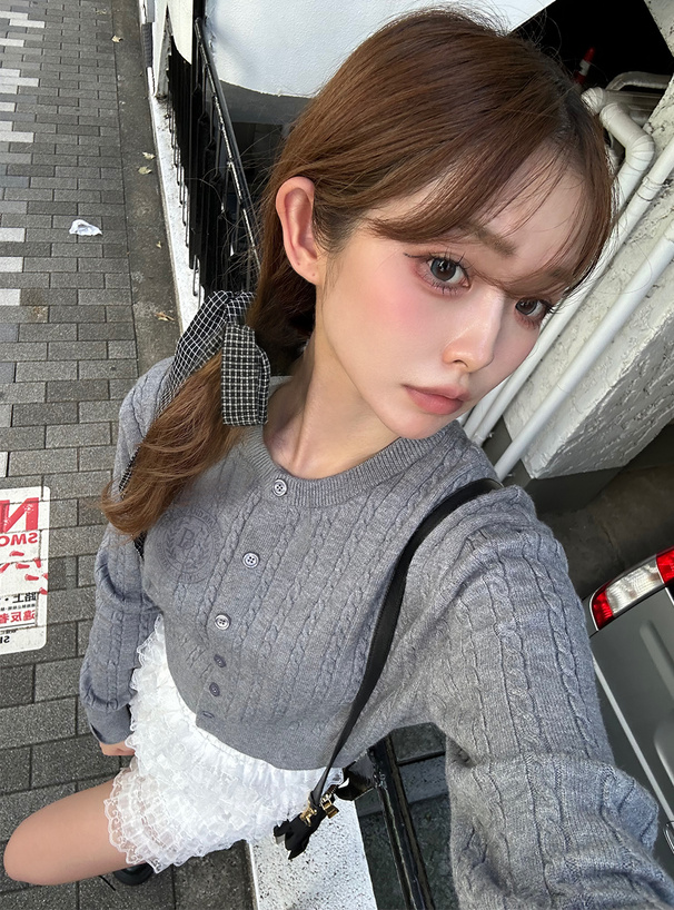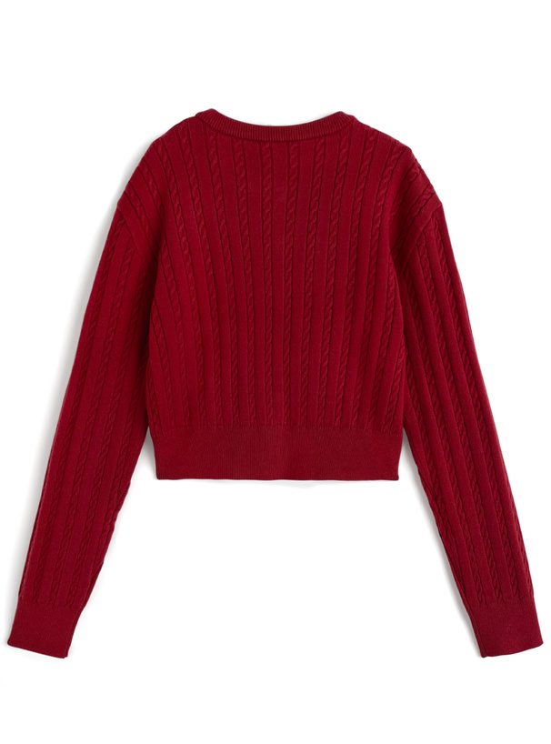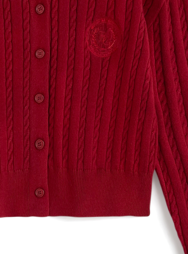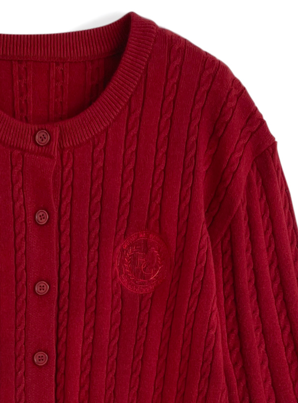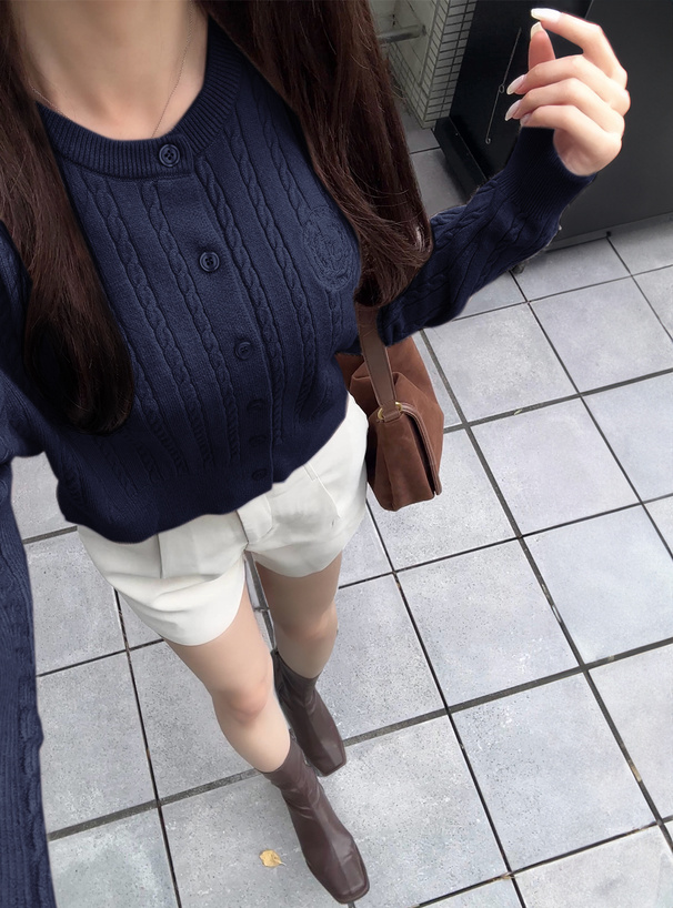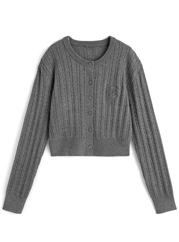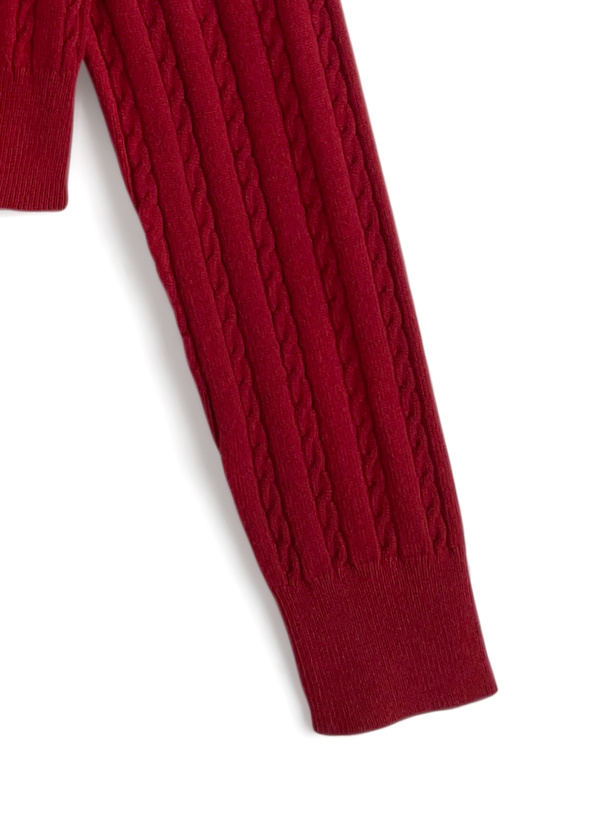 クラシックな印象の細かいケーブル編みニットで仕立てたカーディガン。