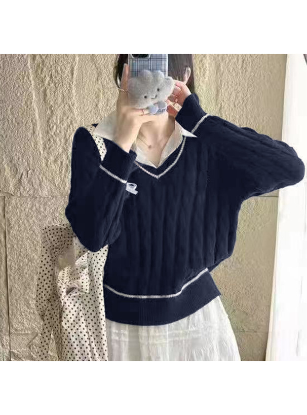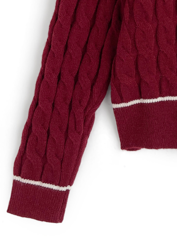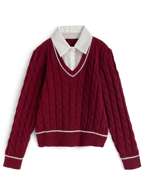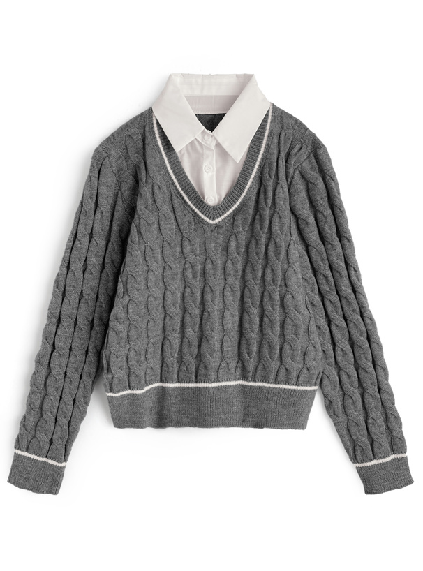 シャツにケーブルニットを組み合わせたようなドッキングトップス。