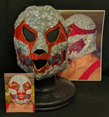プロレスマスク サンチェス製【エル・カネック (銀スパンコール×青緑・赤メタ特殊フチ)】本人使用 サイン入り 着用写真付き