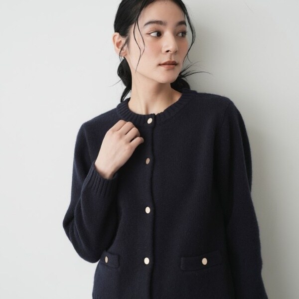 カシミヤ混のウールを使用した丸首カーディガン。