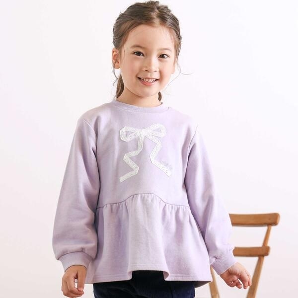 裾にかけてがふんわりと広がるペプラムデザインが女の子らしい、長袖トレーナー。